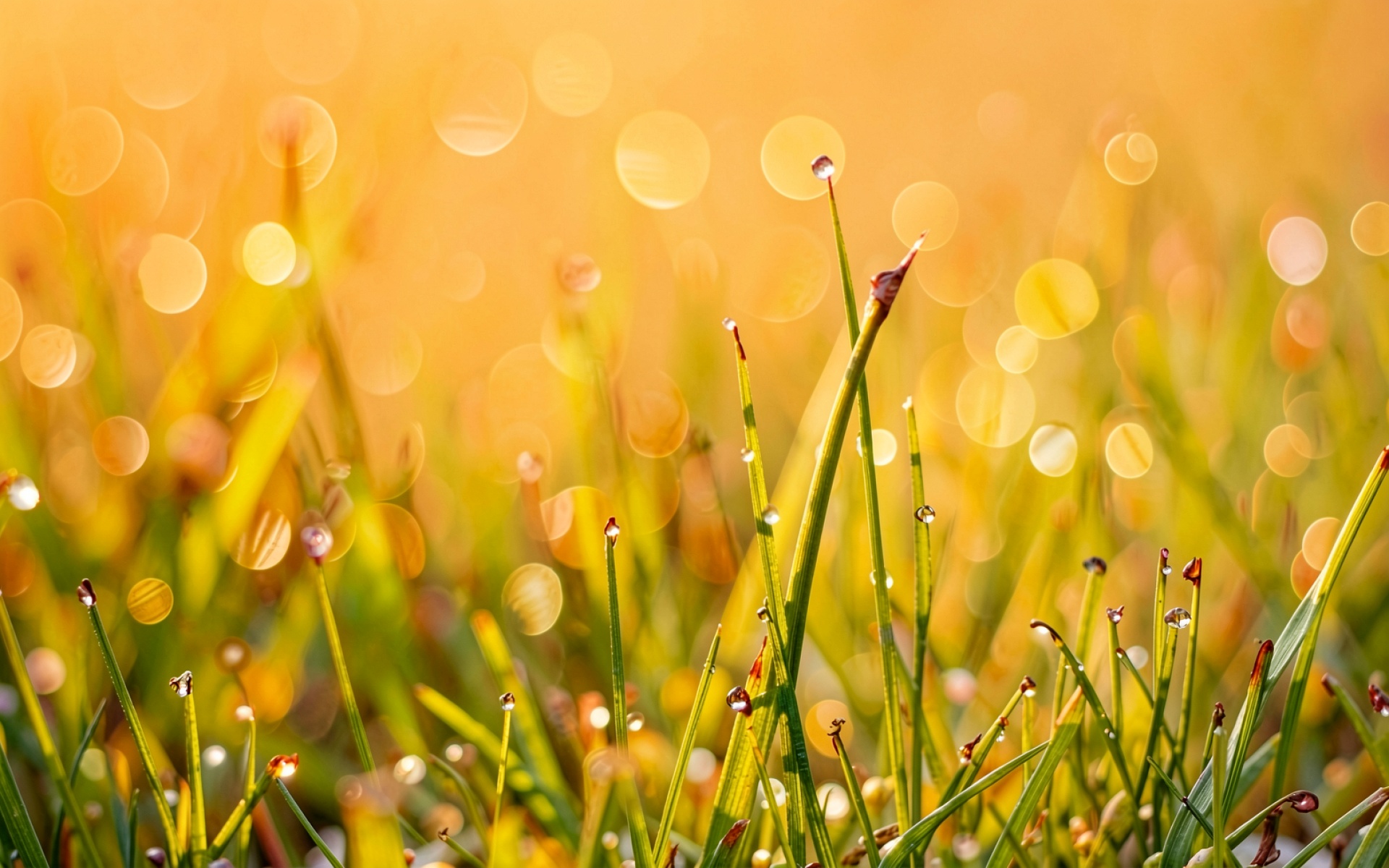 Изображение детально передает сферическую форму водяных капель и глянцевую текстуру стеблей. Освещение создает мягкие блики на поверхности воды, а градиенты фона плавно переходят от золотистого к теплому желтому цвету. Контраст между насыщенной зеленью травы и светящимся боке подчеркивает глубину сцены. На сайте доступен удобный предпросмотр перед скачиванием для оценки качества на экране.