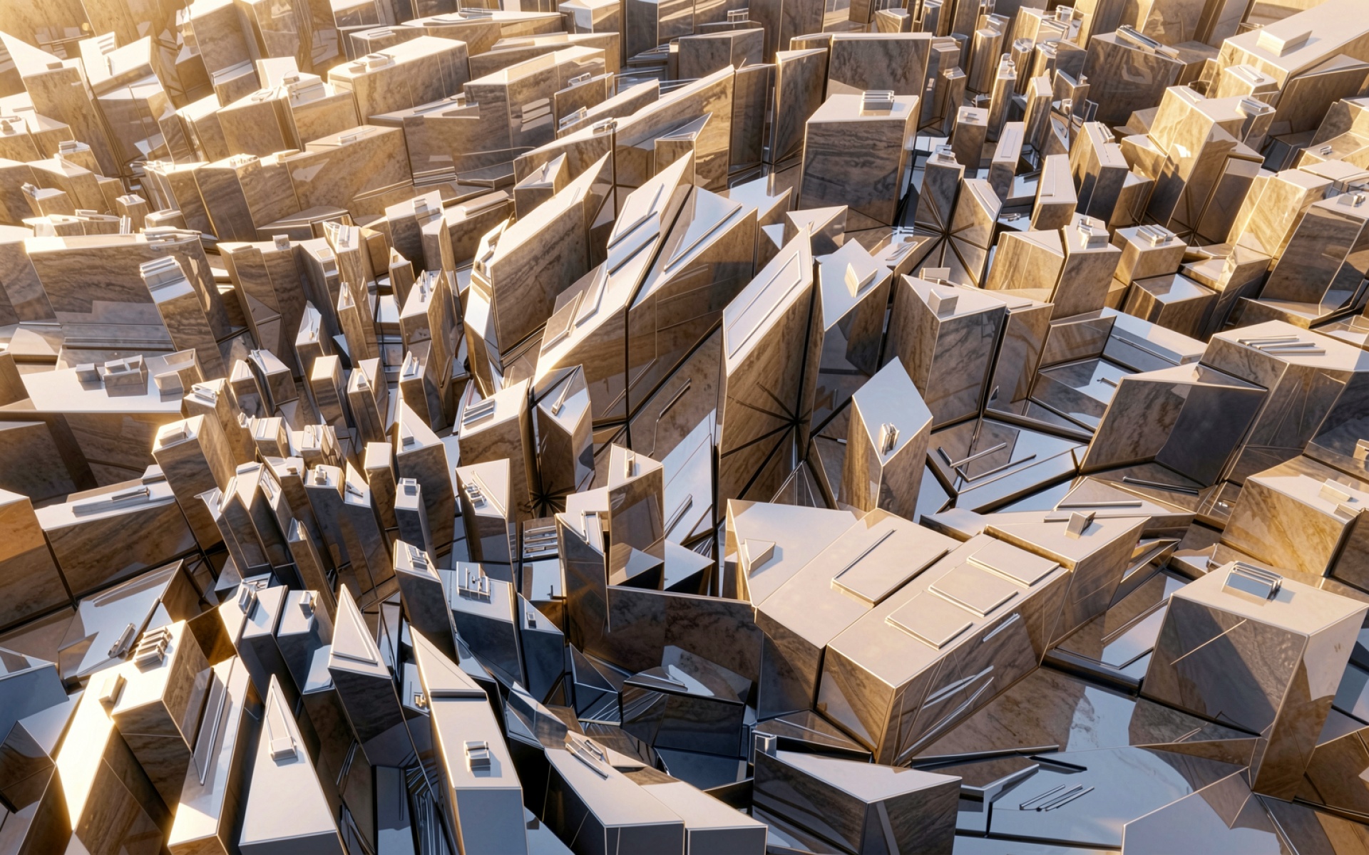 Изображение детально передает текстуру шлифованного бетона с металлическим отливом и четкие грани архитектурных форм. Освещение создает выраженные контрасты между ярко освещенными плоскостями и глубокими тенями в разломах мегаполиса. Градиенты фона плавно переходят от теплого золотистого к нейтральному серому, подчеркивая объем геометрии. На сайте предусмотрен удобный предпросмотр перед скачиванием для оценки качества на экране.