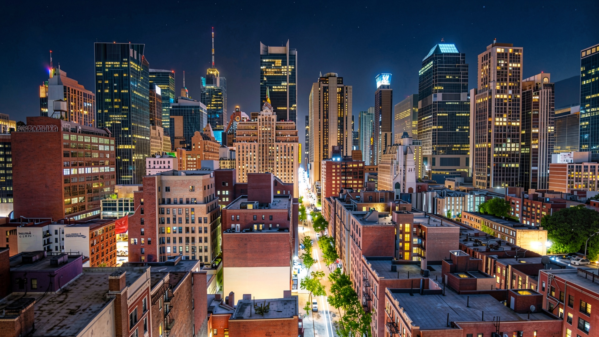 Изображение характеризуется глубоким контрастом между темным ночным небом и яркой иллюминацией окон зданий. Текстуры кирпичных фасадов переднего плана детально проработаны, а градиенты синего цвета в верхней части кадра создают атмосферу спокойствия. Освещение улиц формирует четкие световые дорожки с мягкими тенями, подчеркивая геометрию городской застройки. На сайте предусмотрен удобный предпросмотр перед скачиванием для оценки качества на экране.