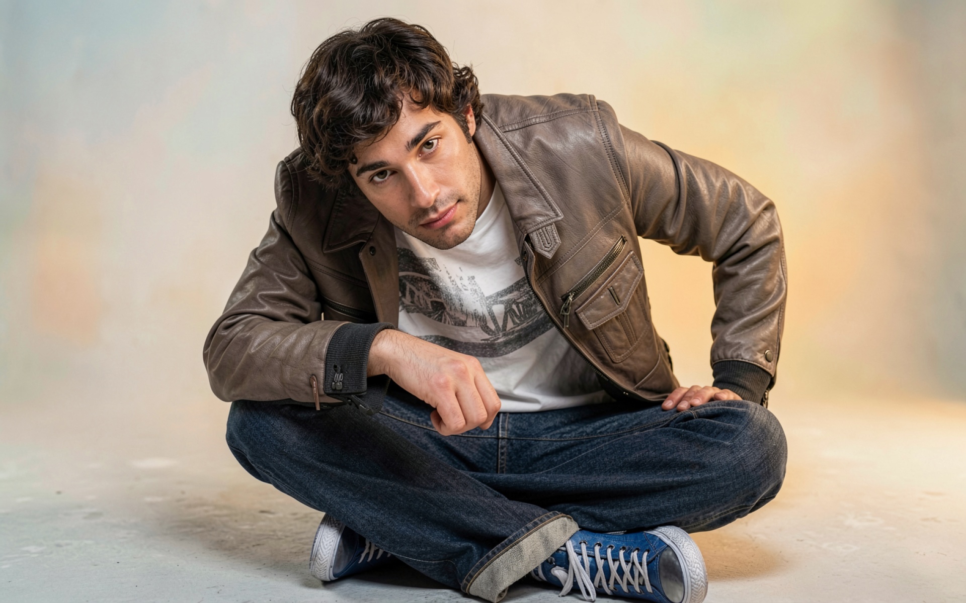 Мужчина в коричневой кожаной куртке на светлом фоне обои