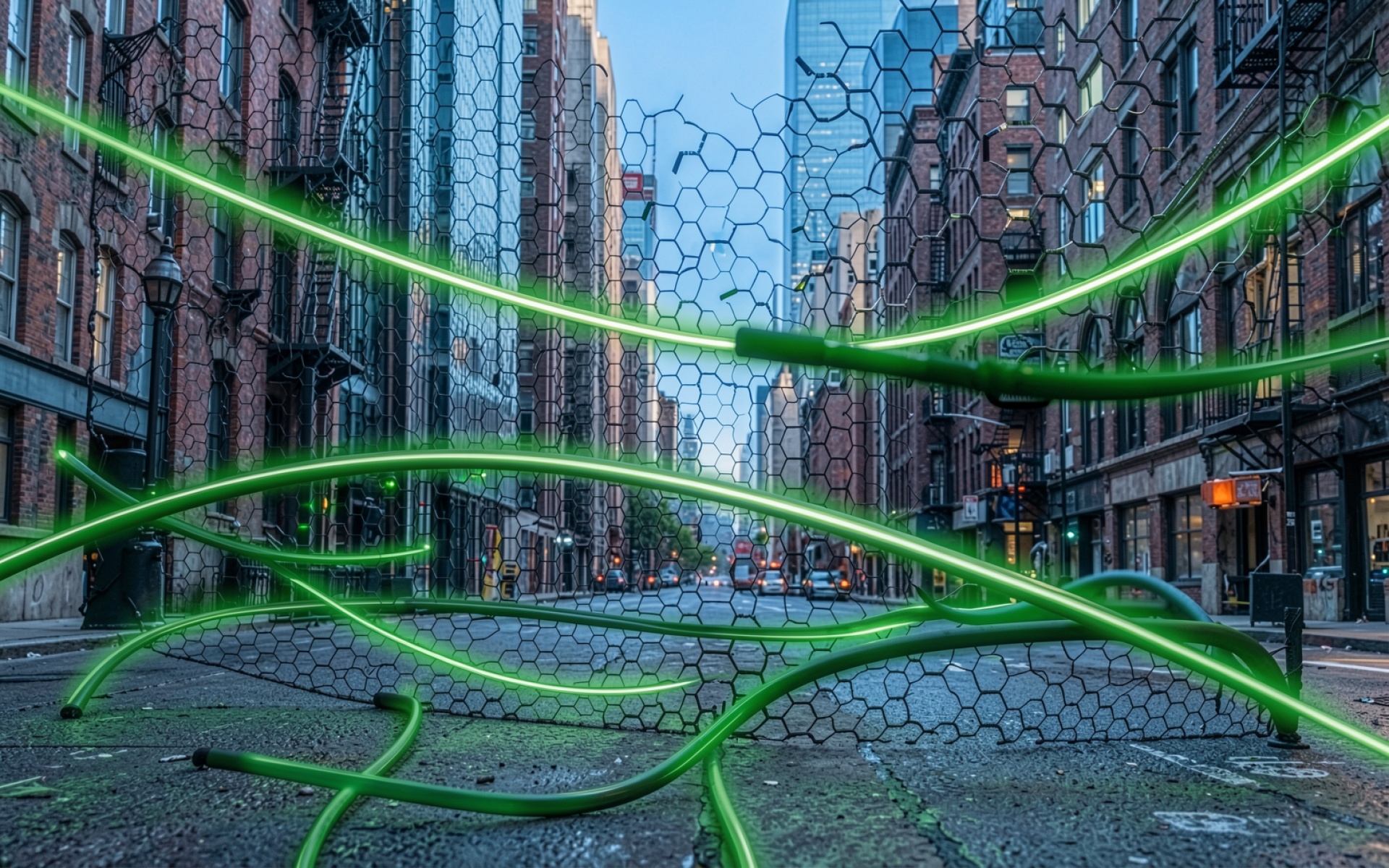 Зеленые неоновые нити в городском переулке обои