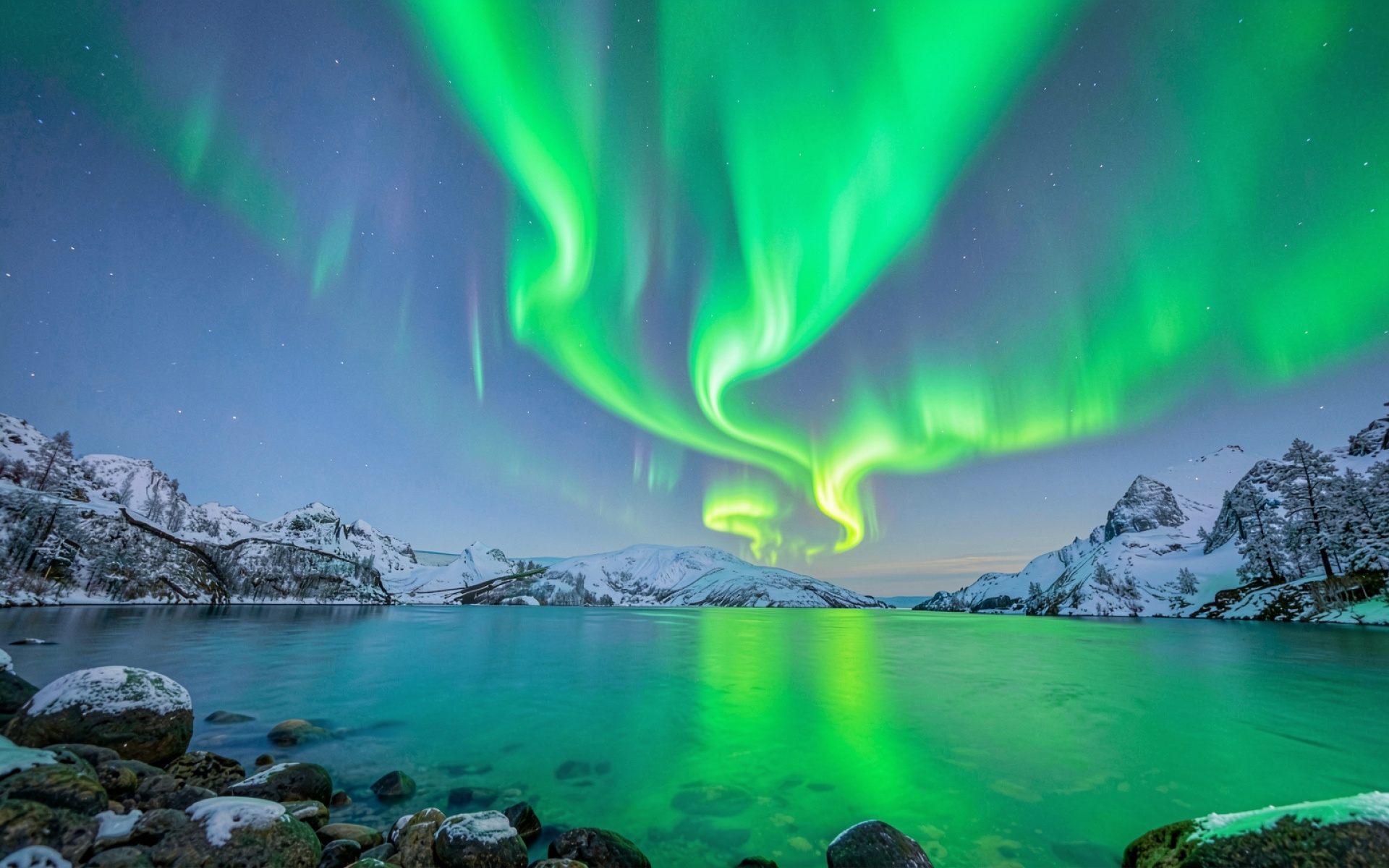 Изображение детально передает динамику световых потоков в небе и их зеркальное отражение на глади воды. Особое внимание уделено градиентам зеленого спектра и контрасту между темным ночным небом и ярко-белыми заснеженными склонами гор. Текстуры камней на переднем плане и мягкие тени в складках рельефа создают объемную композицию. На сайте доступен удобный предпросмотр перед скачиванием, чтобы оценить качество отображения на вашем экране.