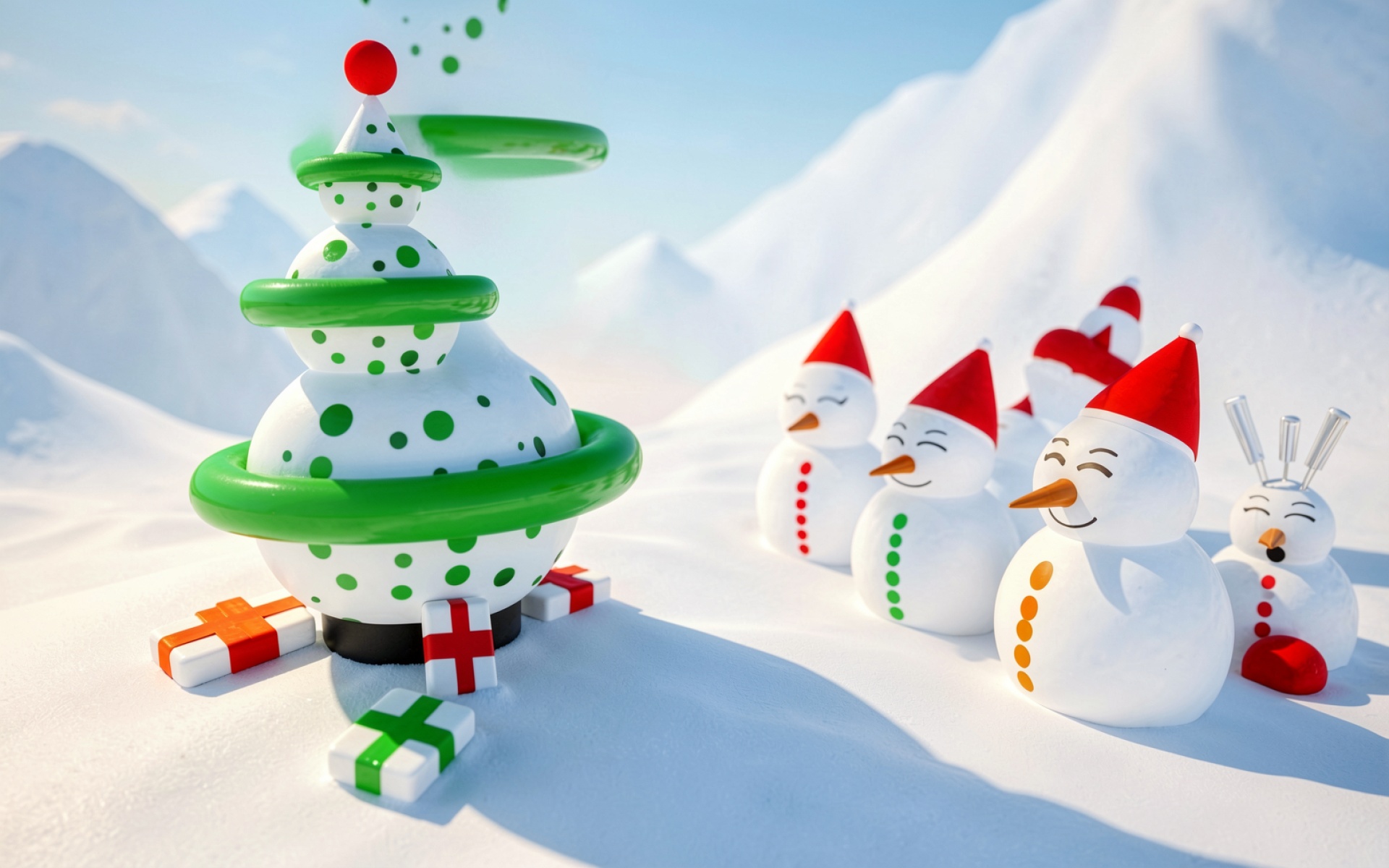 Техническое исполнение обоев подчеркивает гладкую текстуру снега и глянцевый блеск зеленых колец елки. Освещение имитирует яркий зимний день, создавая мягкие голубые тени на белом покрытии и четкие блики на сферических формах снеговиков. Градиенты фона плавно переходят от насыщенного белого к светло-голубому небу. На сайте доступен удобный предпросмотр перед загрузкой, чтобы оценить качество отображения на вашем экране.
