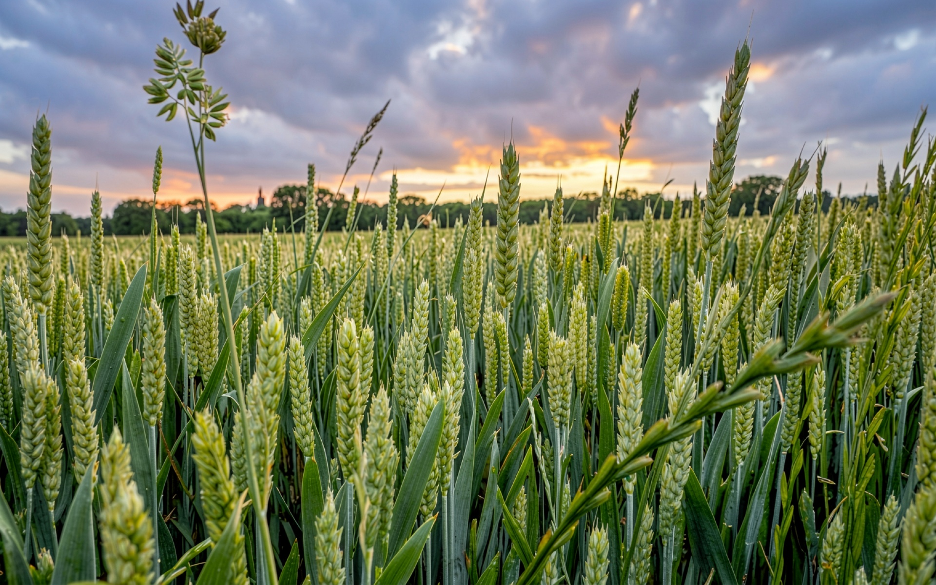Зеленое пшеничное поле в лучах закатного солнца обои
