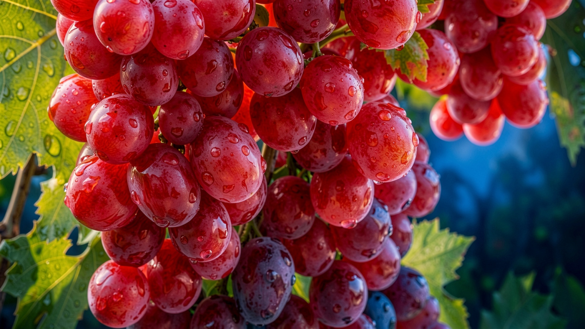 Доступны для скачивания JPG обои Красный виноград с каплями росы утром. Почему стоит скачать именно этот файл? Только этот JPG сохраняет метаданные цветокоррекции.