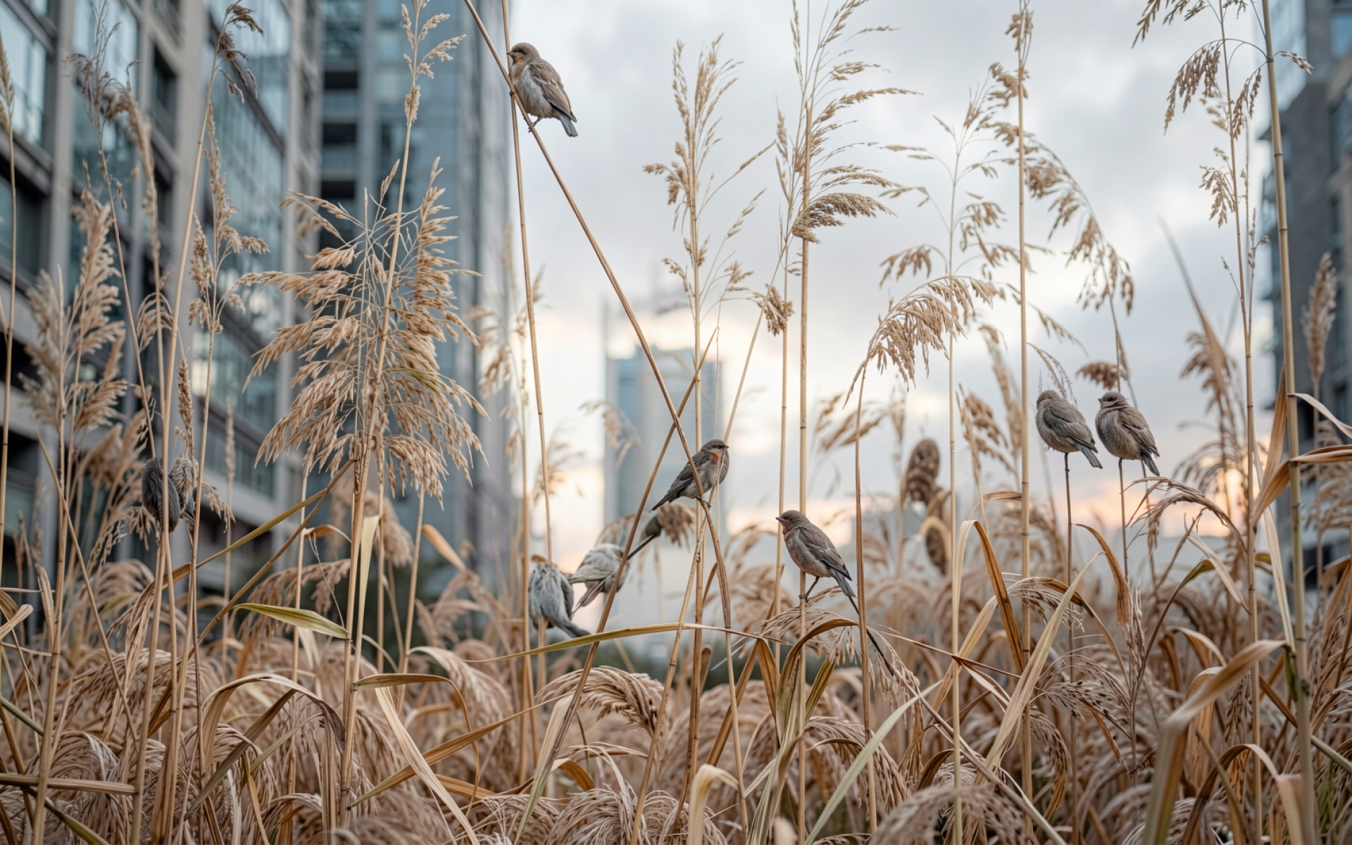 Техническое исполнение кадра акцентирует внимание на текстуре оперения птиц и тонких линиях стеблей. Мягкий градиент закатного неба создает естественную подсветку контуров, а глубокие тени в нижней части композиции добавляют объему. Переходы между бежевыми оттенками колосьев и серыми тонами птиц выполнены плавно, без артефактов. На сайте доступен удобный предпросмотр перед скачиванием для оценки качества на экране.