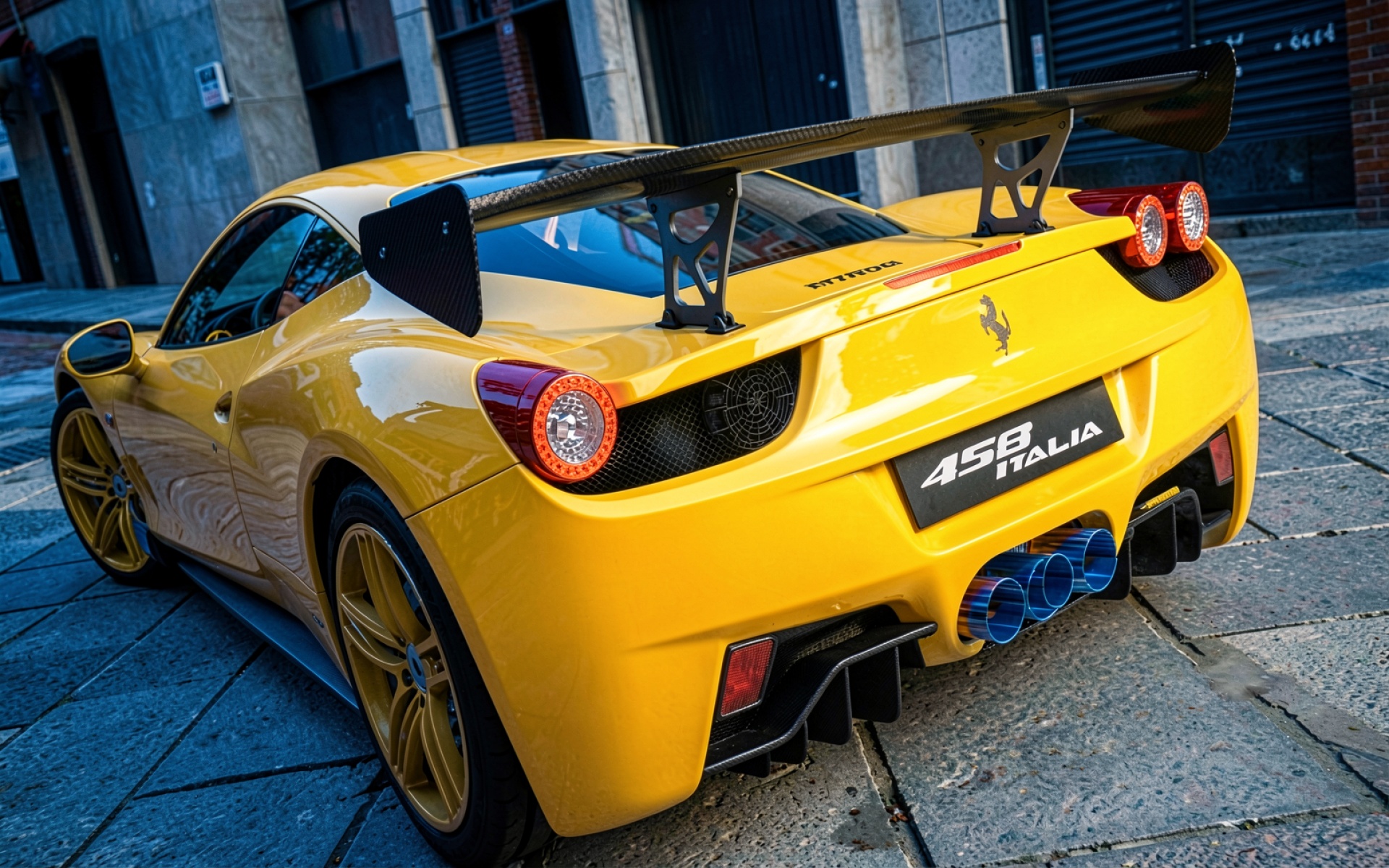 Изображение детально передает глянцевую текстуру кузова, где яркие блики контрастируют с глубокими тенями в области диффузора. Особое внимание уделено карбоновому антикрылу и синим наконечникам выхлопной системы, которые создают цветовой акцент на фоне желтого лака. Градиенты городского фона плавно уходят в расфокус, подчеркивая геометрию автомобиля. На сайте доступен удобный предпросмотр перед скачиванием для оценки качества на экране.