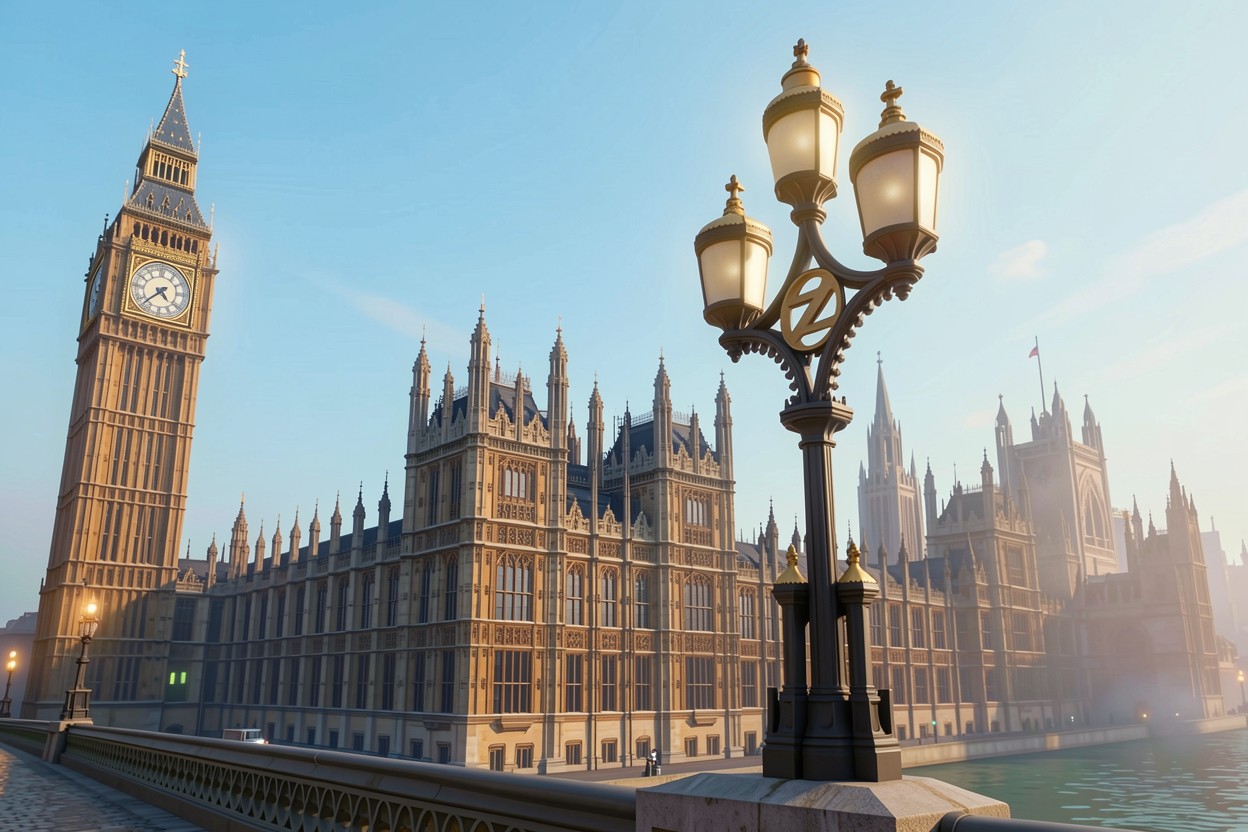 Скачайте изображение Биг-Бена в высоком разрешении, чтобы использовать его как заставку для рабочего стола или в графических проектах. Кадр передает атмосферу Лондона в период золотого часа, когда мягкий солнечный свет подчеркивает готическую архитектуру Вестминстерского дворца и детали уличного фонаря на переднем плане.