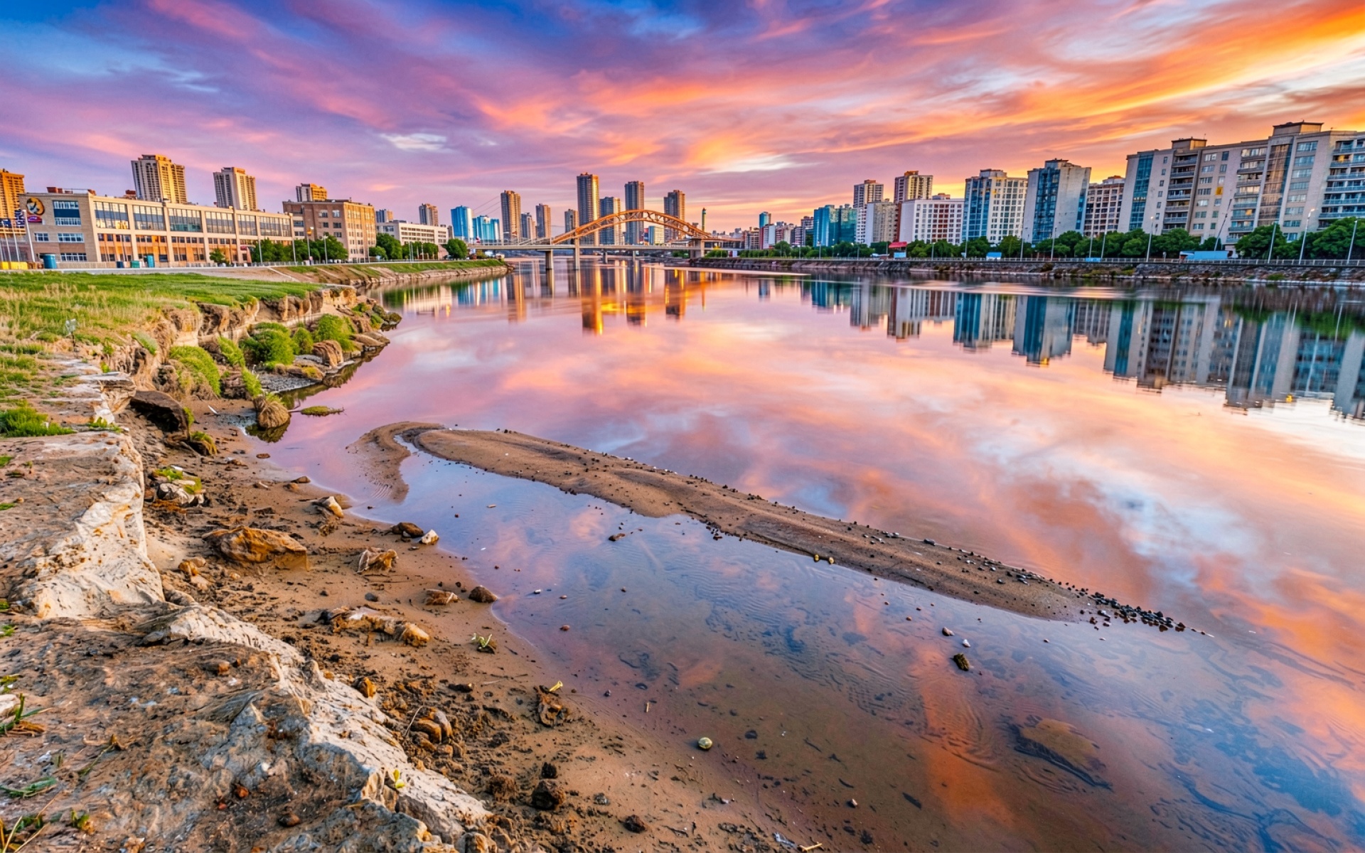 Скачайте JPG файл обоев Городской пейзаж с рекой в закатных тонах на нашем сайте – и вот почему: полная цветопередача сохранена без потери качества.