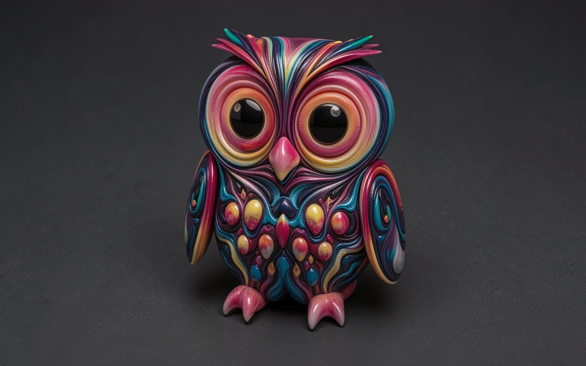Изображение отличается сложной проработкой текстур, имитирующих плавный перелив жидкого пластика или стекла. Цветовые градиенты плавно переходят от глубокого синего к яркому розовому и желтому, создавая объемный эффект. Освещение акцентирует внимание на глянцевых бликах в больших глазах птицы и мягких тенях в нижней части фигуры. Темный однотонный фон подчеркивает контрастность элементов и чистоту линий. Перед загрузкой доступен удобный предпросмотр для оценки качества отображения на вашем экране.