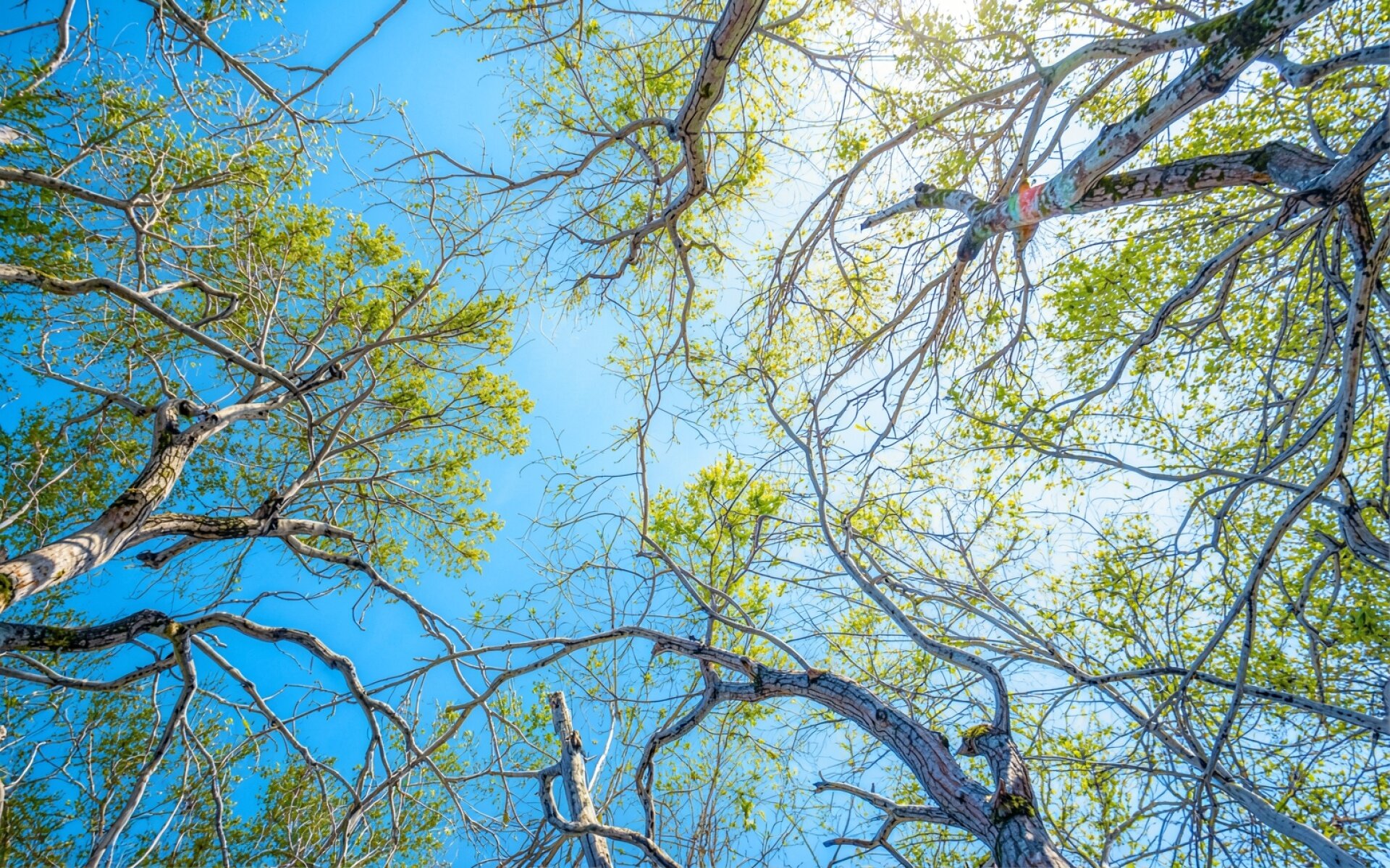 Изображение детально передает шероховатую текстуру коры и тонкие переходы светло-зеленой листвы. Естественное освещение создает мягкие блики на ветвях и глубокие тени в местах пересечения стволов, а градиент неба плавно переходит от насыщенного лазурного к светлому горизонту. На сайте доступен удобный предпросмотр перед скачиванием для оценки качества отображения на экране.