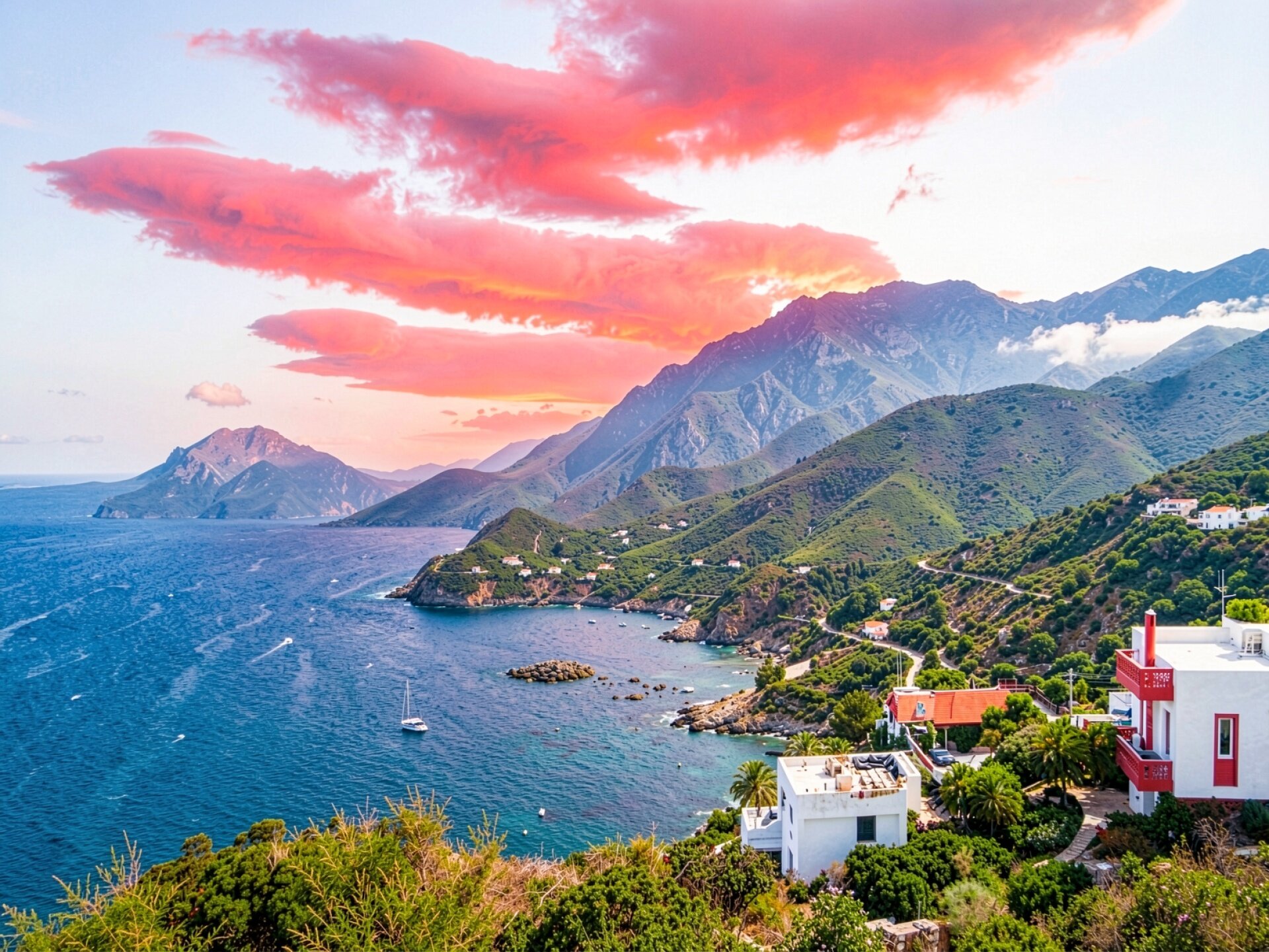 Изображение характеризуется мягким градиентом неба от нежно-голубого к насыщенному розовому. Освещение создает выраженные блики на поверхности воды и глубокие тени в складках горных массивов. Текстуры прибрежной растительности и белых стен зданий переданы с высокой детализацией, что подчеркивает контраст между природным ландшафтом и архитектурой. На сайте предусмотрен удобный предпросмотр перед скачиванием для оценки качества на экране.