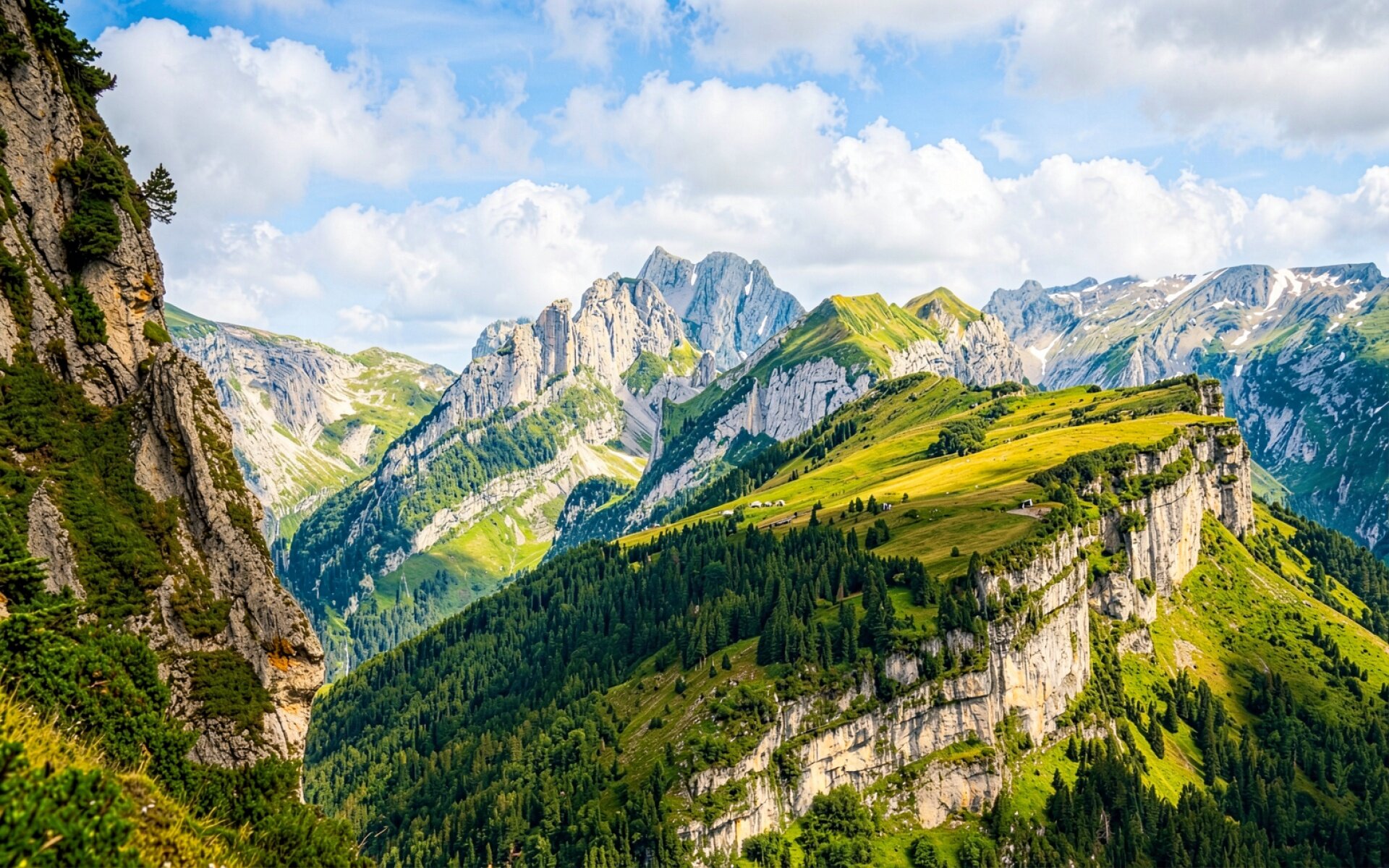 Альпийские горы с зелеными склонами и облаками обои