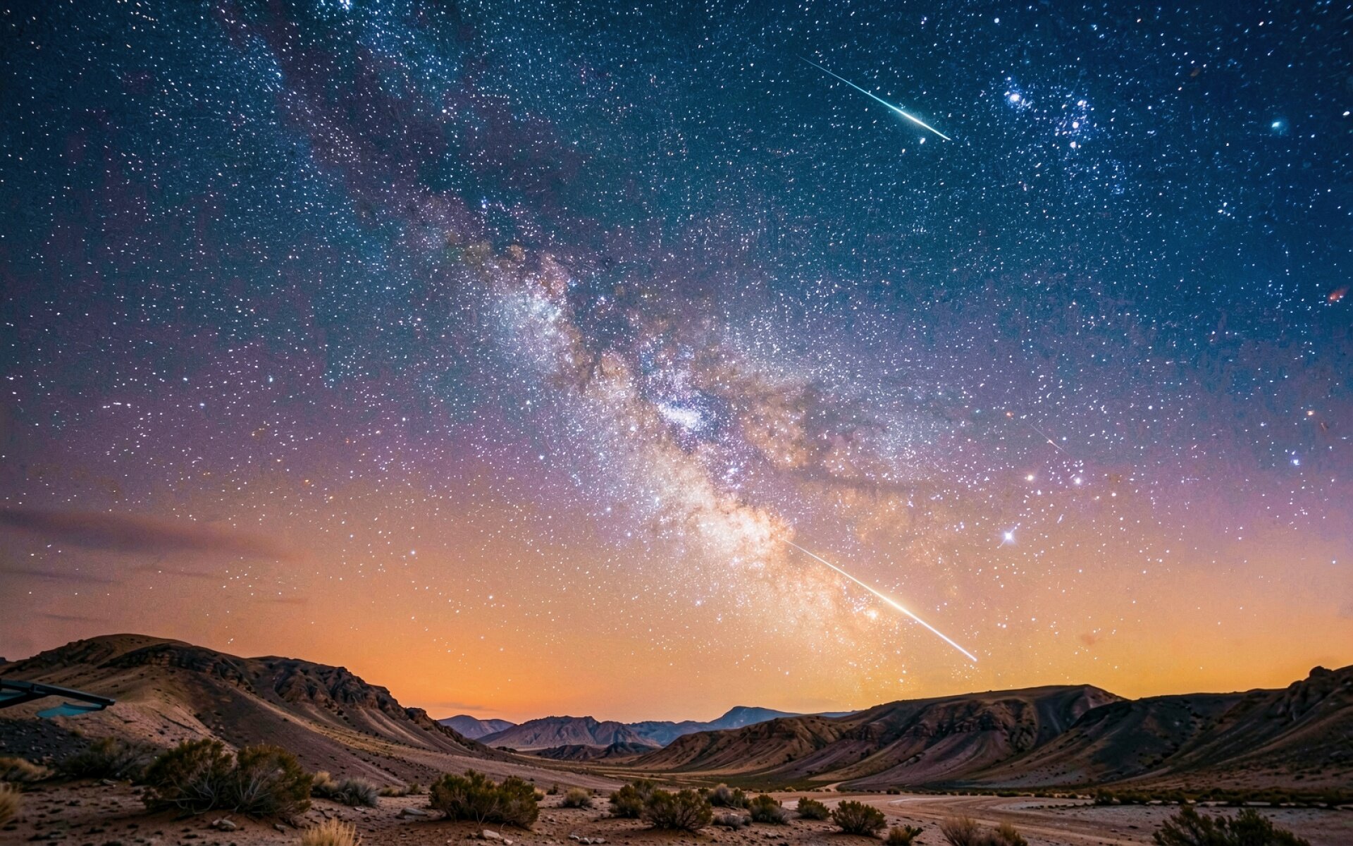 Скачайте изображение Млечного пути в высоком разрешении для обновления рабочего стола и создания атмосферы спокойствия. Снимок демонстрирует плотную звездную структуру галактики, два ярких метеора и градиент горизонта от глубокого синего до теплого оранжевого над засушливым ландшафтом.