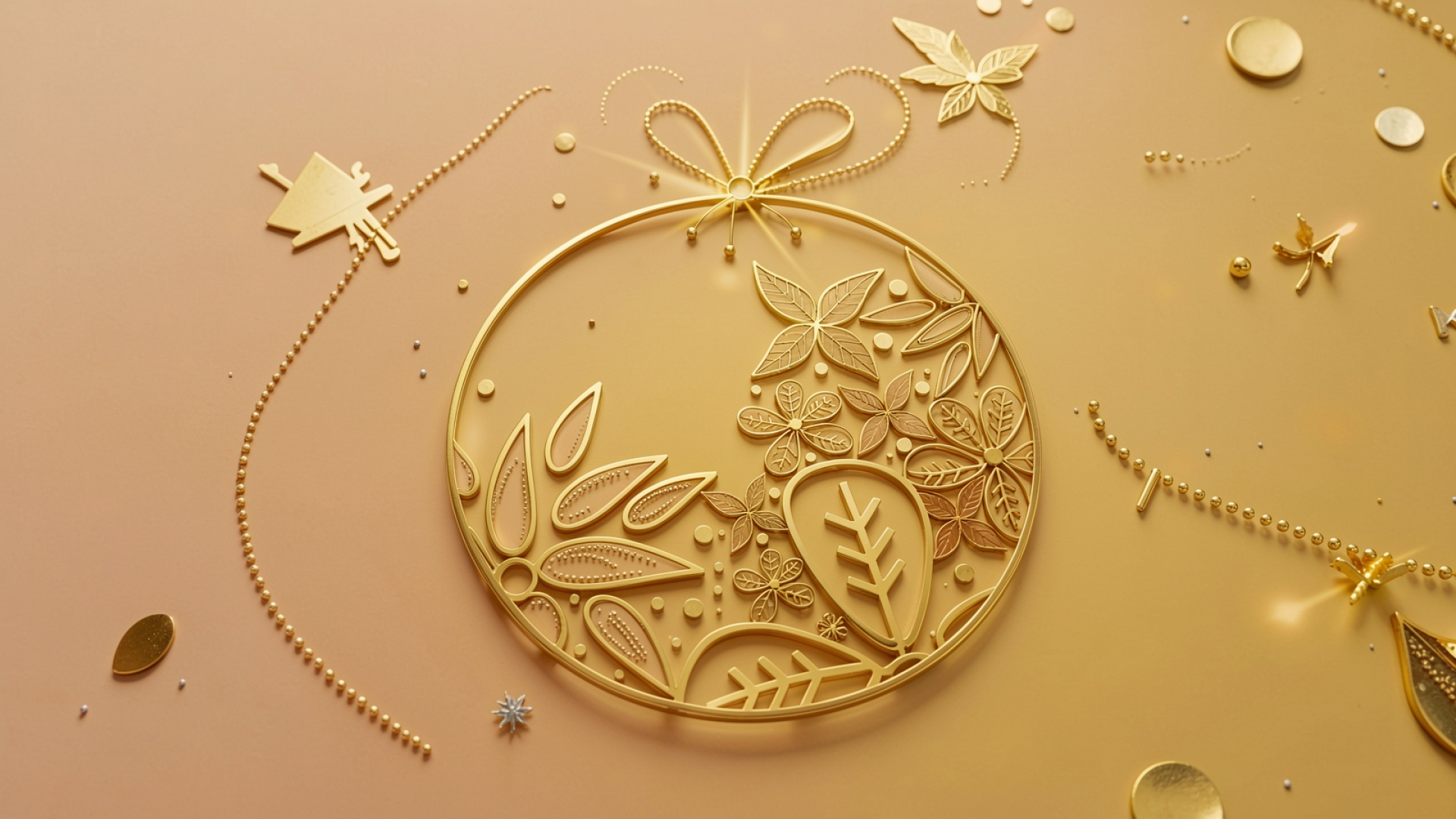 Центральный элемент представляет собой ажурный шар с детализированным растительным узором, имитирующим технику филиграни. Освещение настроено так, чтобы подчеркнуть металлический блеск и четкость линий каждой детали. Согласно стандартам цветопередачи sRGB, которые описывает color.adobe.com, подобные оттенки золота обеспечивают высокую контрастность при сохранении мягкости переходов. Техническое исполнение картинки характеризуется отсутствием шумов и высокой плотностью пикселей, что позволяет масштабировать изображение без потери качества.