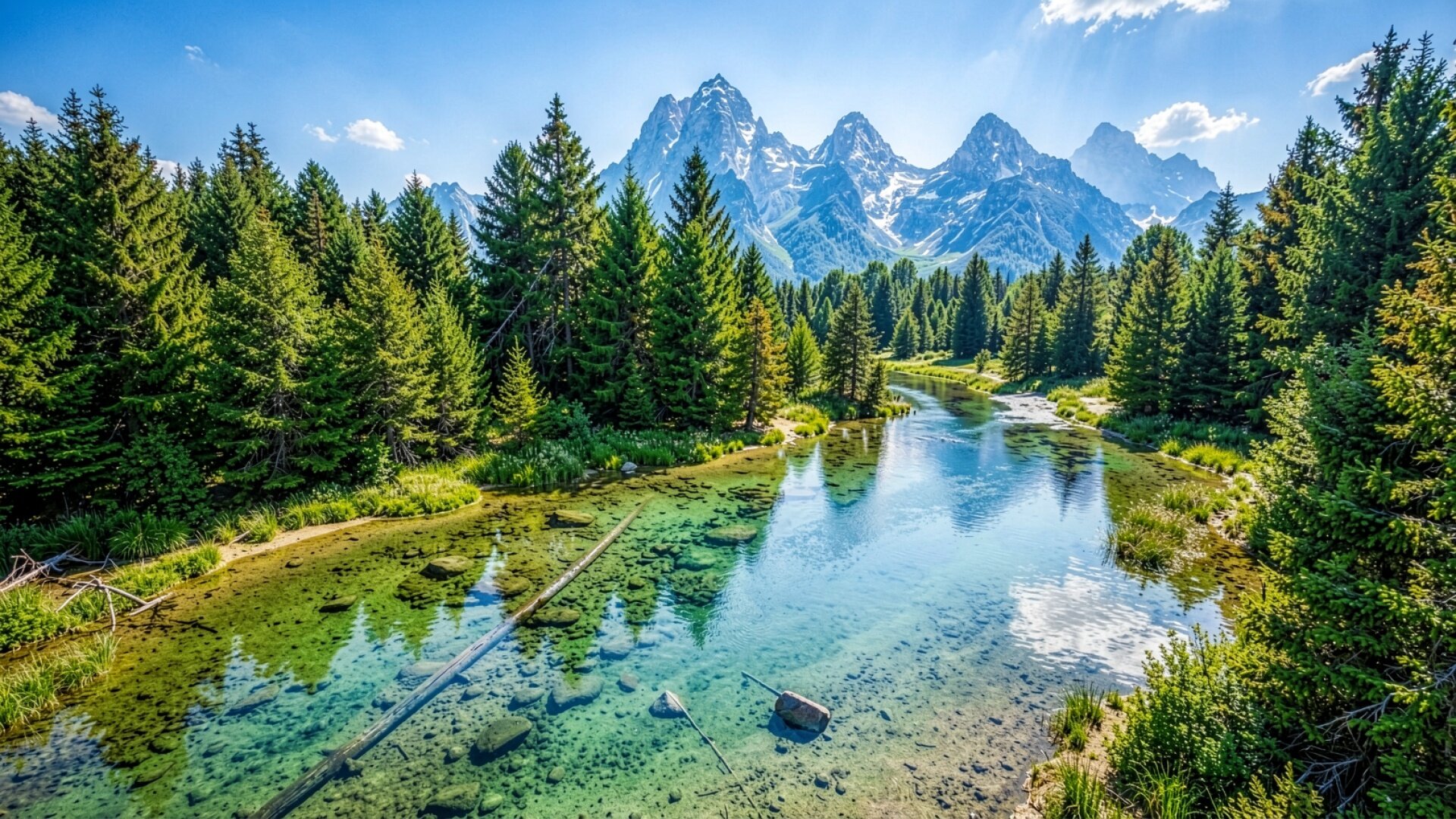 Изображение детально передает текстуру хвои и прозрачность водной глади. Освещение имитирует яркий дневной свет, создавая четкие блики на поверхности реки и глубокие тени в гуще леса. Градиенты неба плавно переходят от насыщенного голубого к светлому горизонту, подчеркивая контраст с острыми пиками гор. На сайте доступен удобный предпросмотр перед загрузкой для оценки качества на экране.