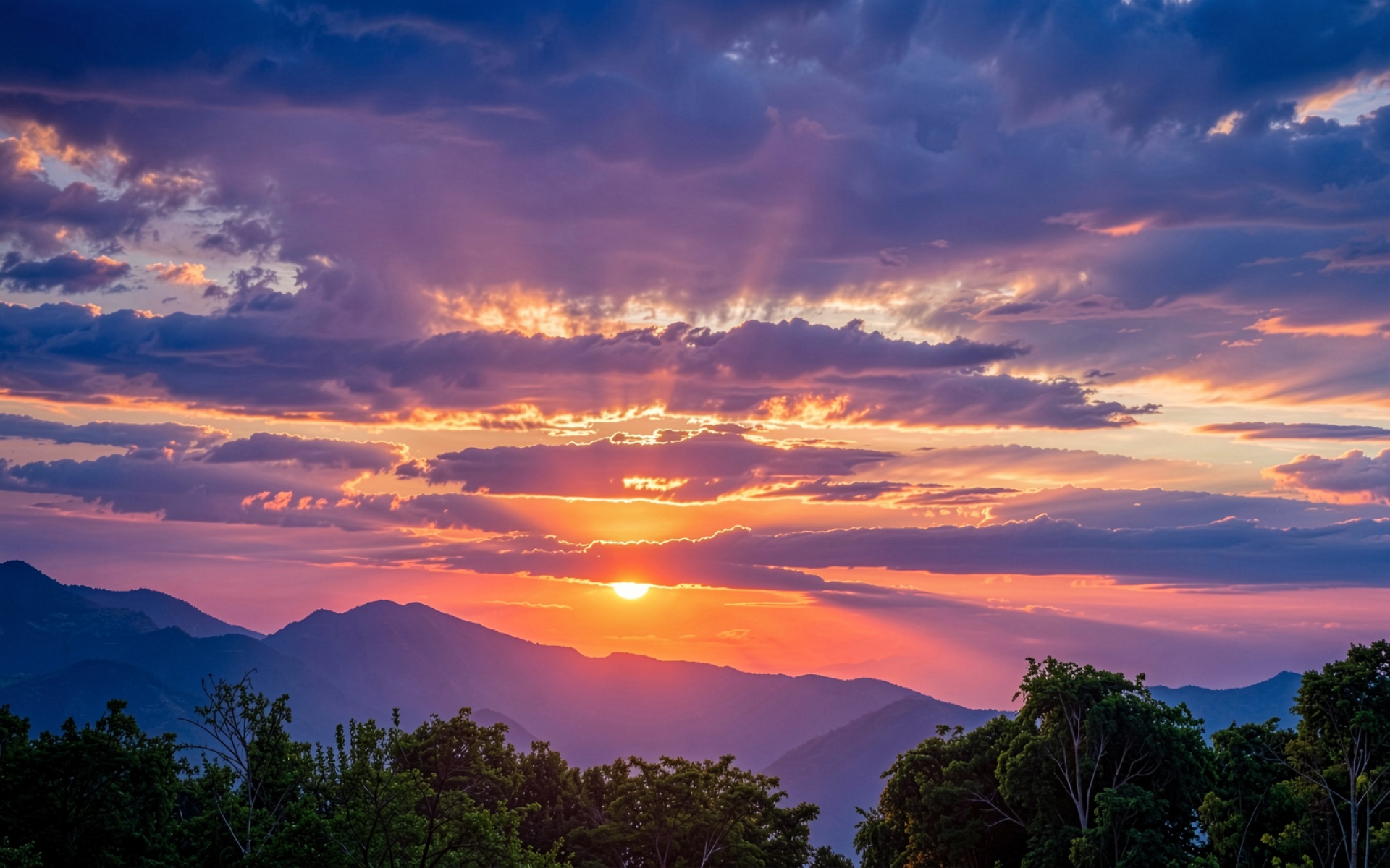 Изображение детально передает градиенты неба от глубокого индиго до ярко-оранжевого у горизонта. Особое внимание уделено текстуре кучевых облаков, которые создают выразительный контраст с мягким свечением заходящего солнца. Световые лучи пробиваются сквозь разрывы в облачном слое, формируя четкие блики на склонах горных хребтов и темных силуэтах деревьев на переднем плане. Сайт предоставляет удобный предпросмотр перед загрузкой для оценки качества отображения цветов на вашем экране.