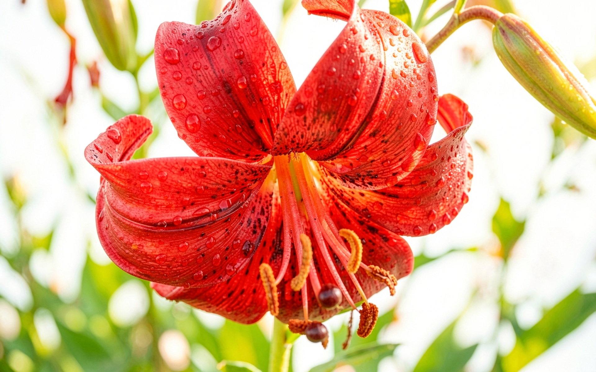 Красная лилия с каплями росы утром обои