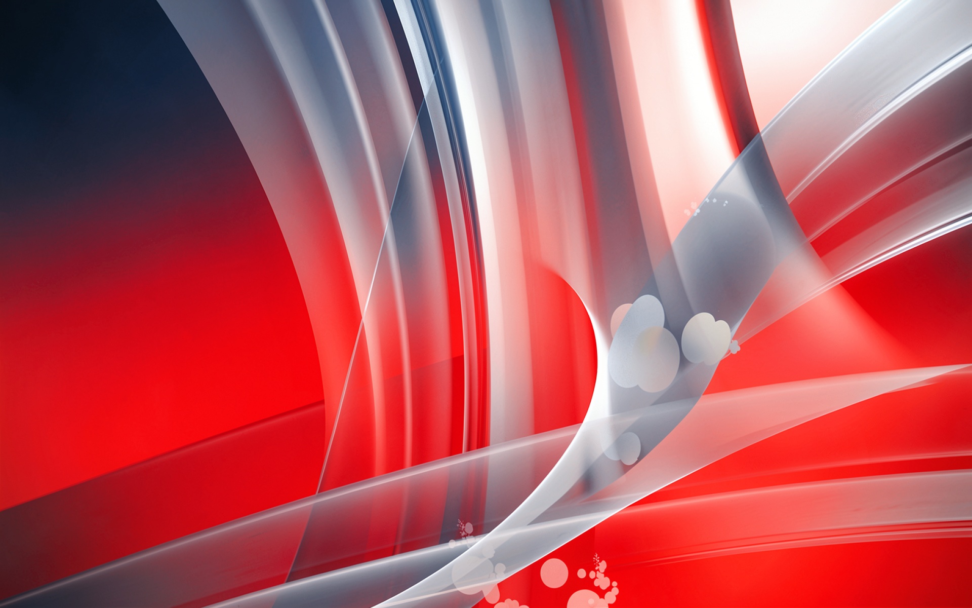 Изображение характеризуется динамичными изгибами с четким разделением цветовых зон. Белые глянцевые поверхности создают выраженные блики, которые контрастируют с глубокими красными градиентами фона. Плавные переходы теней подчеркивают объем трехмерных лент, а мелкие светлые сферы добавляют композиции детализации. На сайте предусмотрен удобный предпросмотр перед загрузкой для оценки качества отображения на экране.