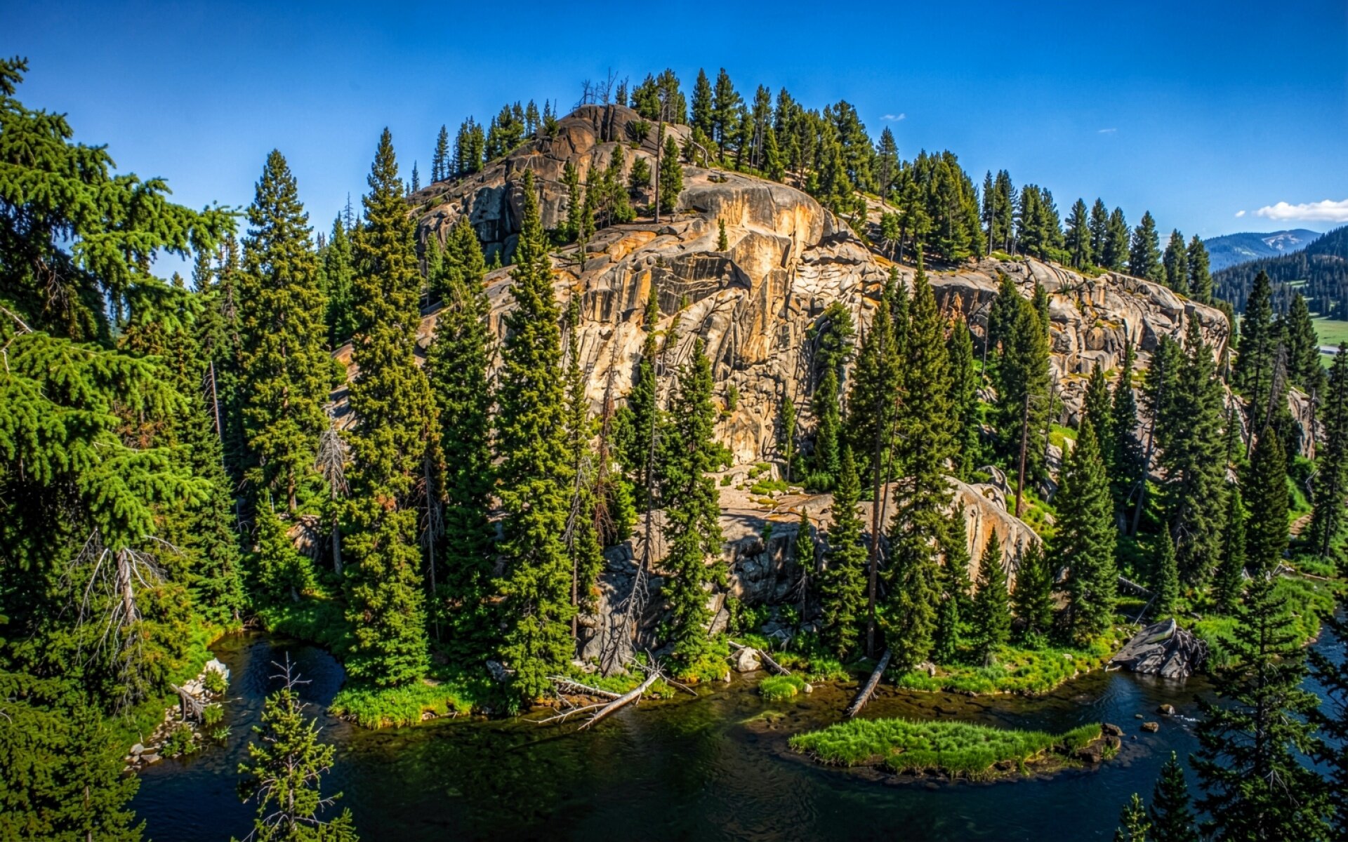 Скачайте с нашего сайта обои Скалистая гора в хвойном лесу у реки в формате JPG, так как эта JPG версия сохраняет все оттенки теней и света.