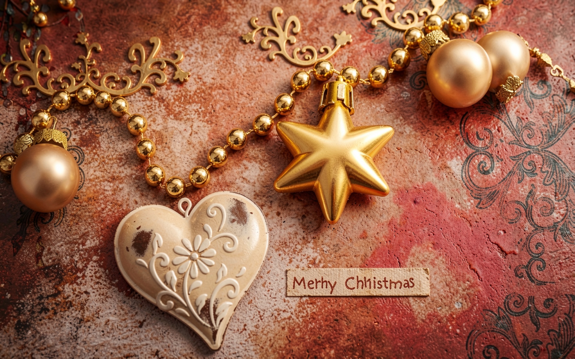 Скачайте это изображение в высоком разрешении для создания праздничного настроения и использования в графическом дизайне. Композиция объединяет классические символы зимних праздников: золотую звезду, сердце с цветочным орнаментом и глянцевые шары на текстурированном красном фоне.