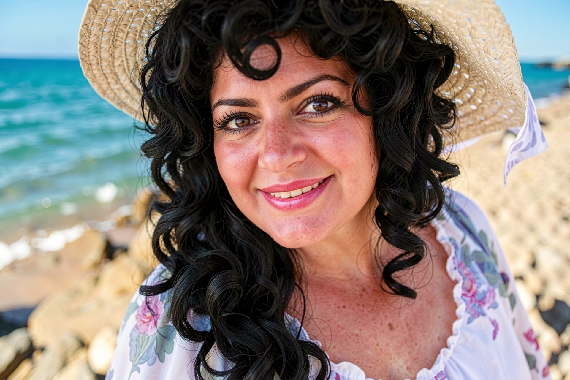 Портрет выполнен с акцентом на детализацию текстур: видны отдельные волокна соломенной шляпы и четкие завитки темных волос. Освещение соответствует полуденному солнцу, что создает высокую контрастность и насыщенные цвета морской воды на заднем плане. Технически снимок характеризуется малой глубиной резкости, которая отделяет объект от береговой линии. Согласно стандартам цветопередачи sRGB, которые описывает сайт adobe.com, правильный баланс белого в таких кадрах позволяет сохранить естественный тон кожи при ярком дневном свете.