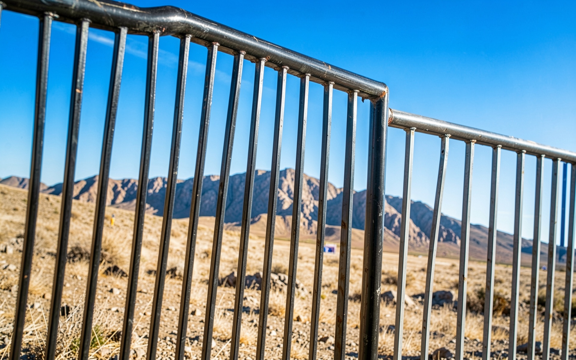 Снимок характеризуется высокой детализацией текстур: видна коррозия металла на верхнем поручне и зернистая структура засушливой почвы. Цветовая палитра базируется на глубоком синем цвете неба (Clear Sky) и охристых оттенках пустыни. Согласно данным nationalgeographic.com, подобные аридные зоны характеризуются экстремальным перепадом температур, что влияет на износ металлических конструкций. Технически изображение обладает правильной экспозицией, где свет падает под углом, подчеркивая объем скал и создавая четкие тени между прутьями забора.