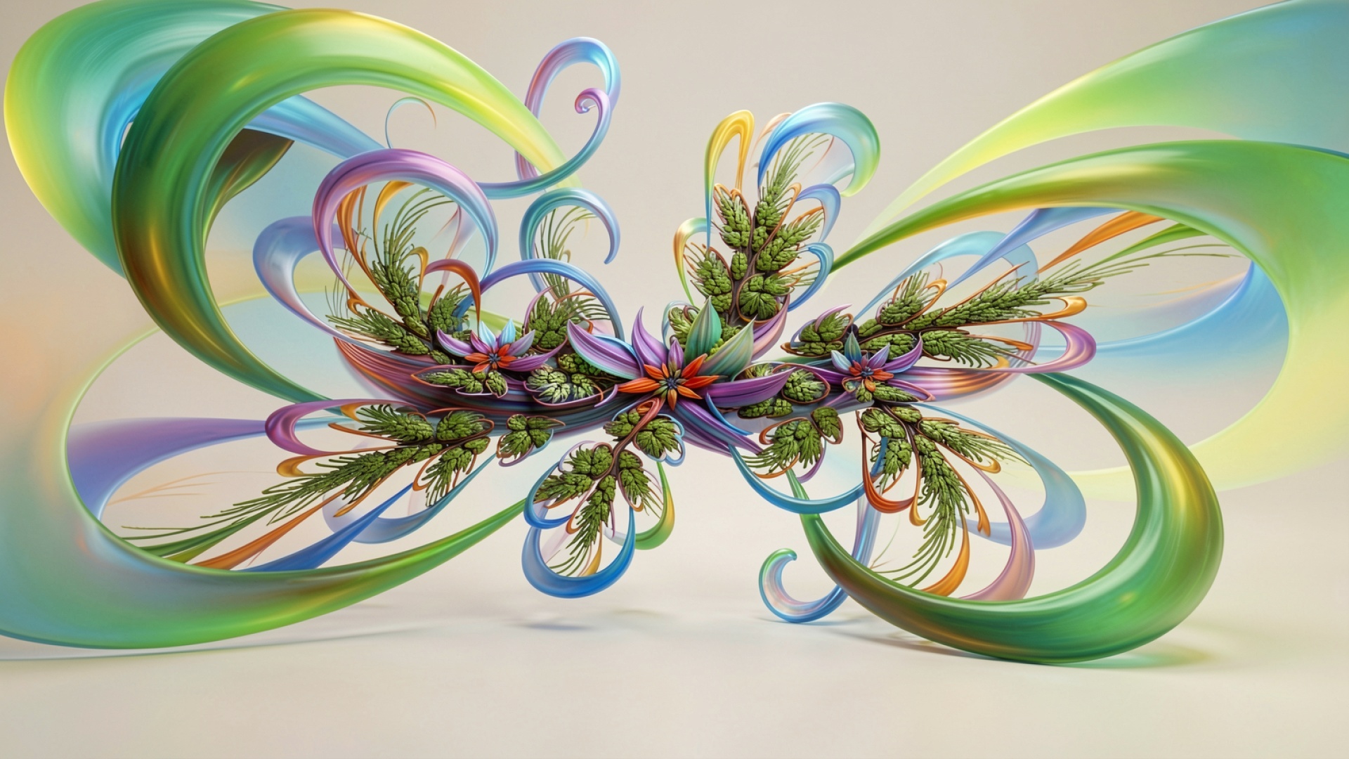 Изображение характеризуется сложной геометрией переплетающихся линий с плавными градиентами от зеленого к синему и фиолетовому. Особое внимание уделено детализации тонких растительных элементов в центре композиции, где свет создает четкие блики на глянцевых поверхностях завитков. Мягкие тени под объектом создают эффект объема, отделяя структуру от нейтрального фона. На сайте предусмотрен удобный предпросмотр перед скачиванием для оценки качества на экране.