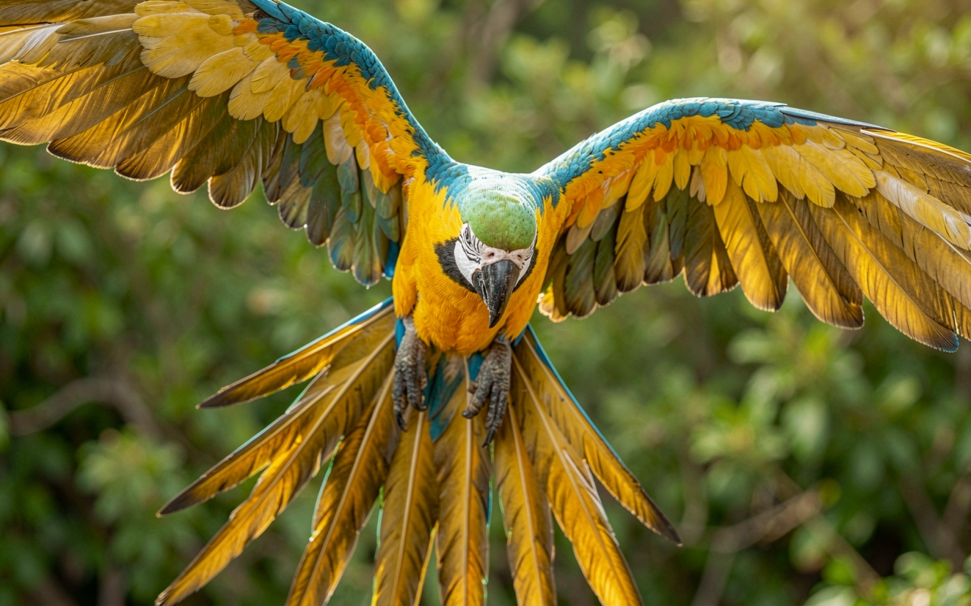 Изображение детально передает структуру перьев с четкими переходами от насыщенного синего к ярко-желтому. Освещение подчеркивает объем крыльев, создавая мягкие блики на верхних контурах и глубокие тени в складках оперения. Фон представляет собой плавный градиент зеленой листвы с эффектом размытия, что выделяет центральный объект. На сайте доступен удобный предпросмотр перед скачиванием для оценки качества на экране.