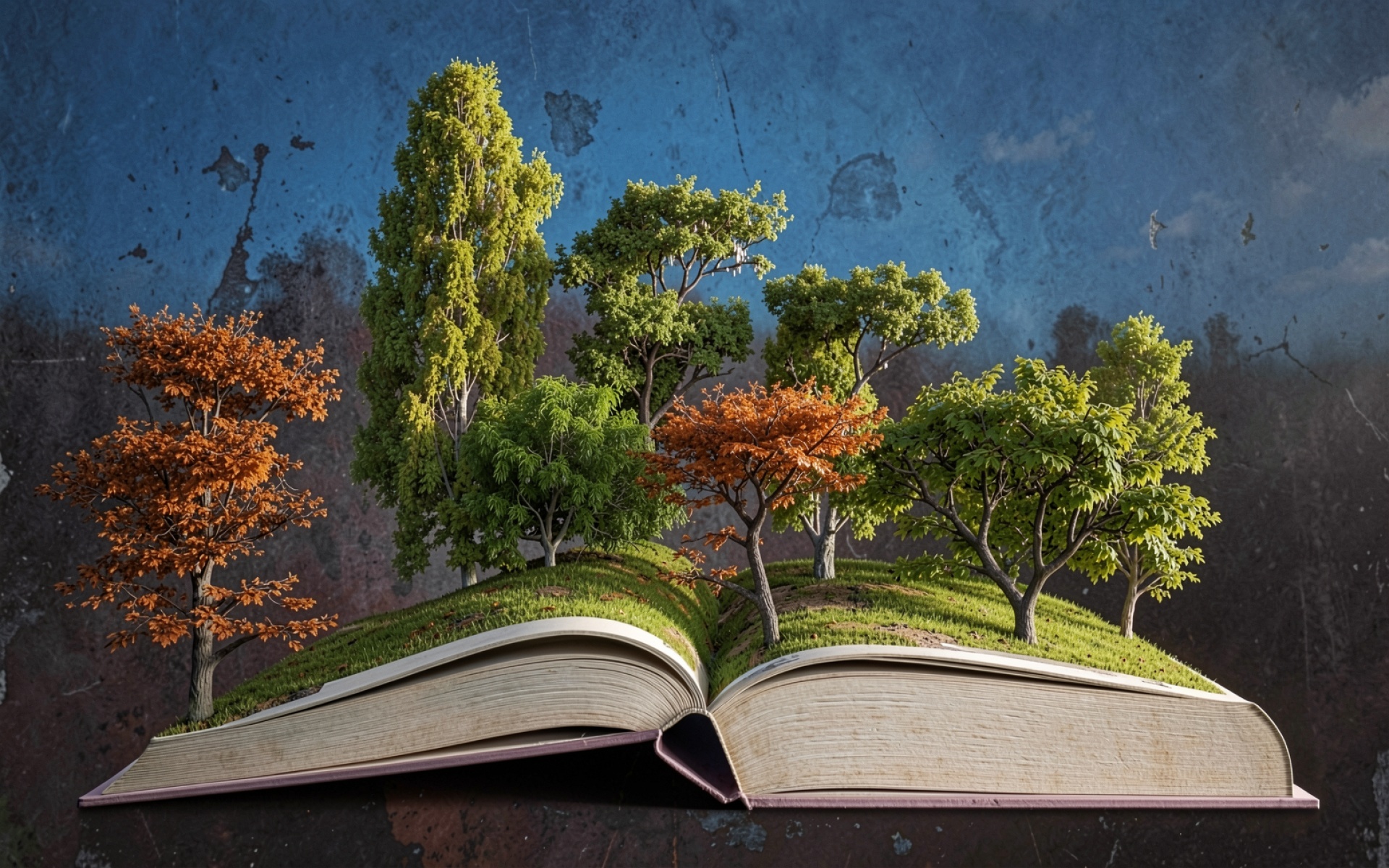 Композиция выделяется детальной проработкой коры деревьев и текстурой бумажных страниц. Освещение создает мягкие переходы между ярко-зеленой листвой и осенними рыжими оттенками, формируя глубокие тени в основании стволов. Градиент синего фона подчеркивает контраст с природными цветами объектов. На сайте доступен удобный предпросмотр перед скачиванием для оценки качества на экране.