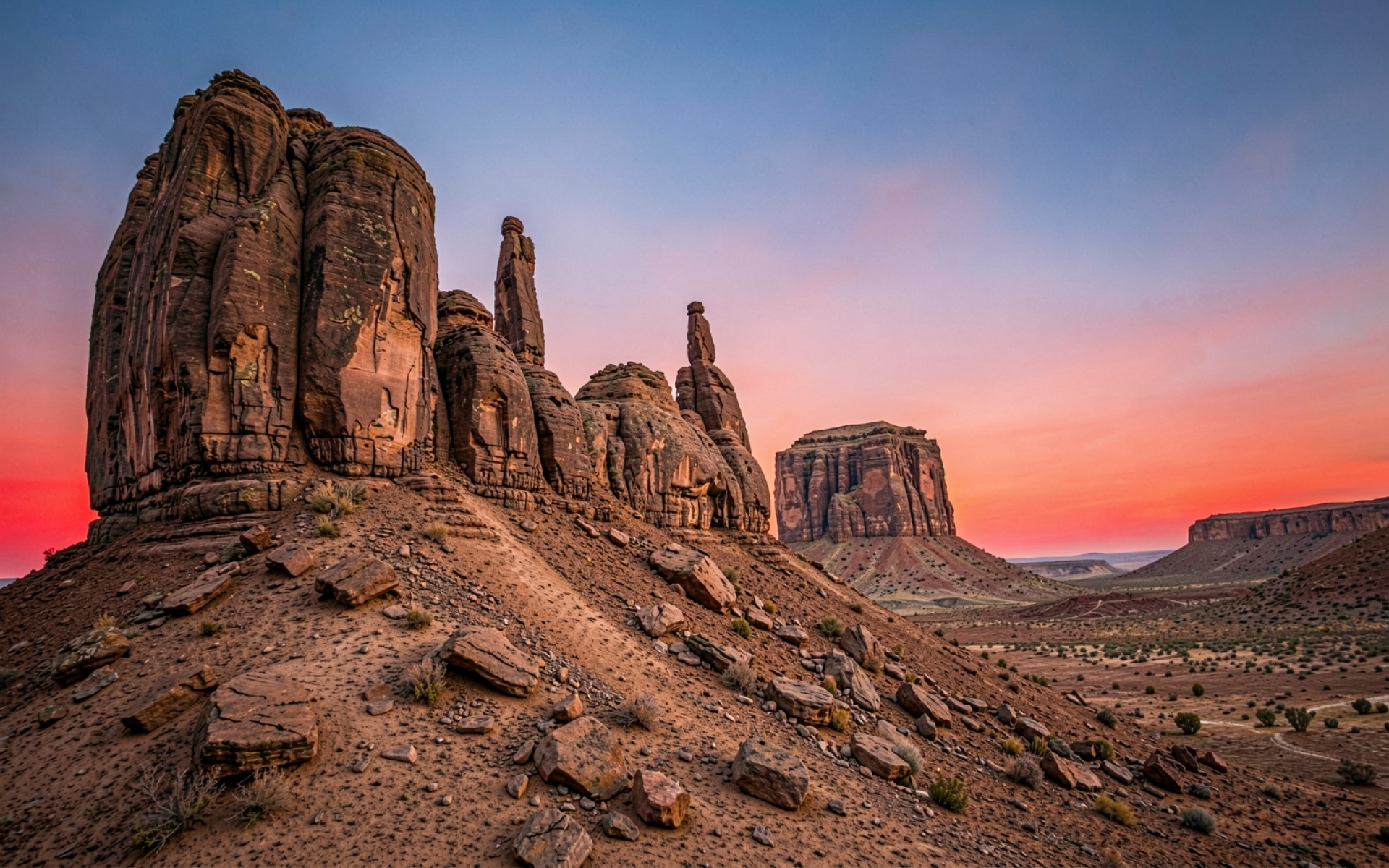 На нашем сайте вы можете скачать обои Красные скалы Долины монументов в закатном свете в JPG для ПК или телефона – и вот почему: другие сайты обрезают края, но у нас полный кадр.