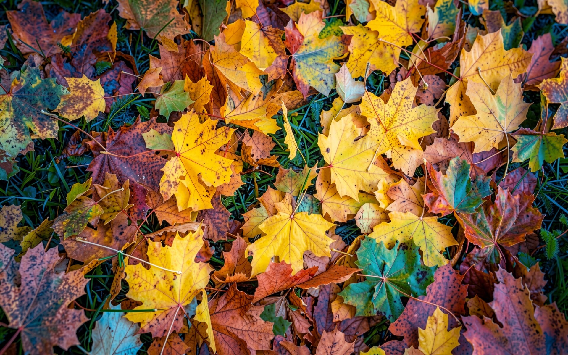Изображение передает детальную текстуру прожилок каждого листа и естественные переходы между охристыми и багряными оттенками. Мягкое рассеянное освещение подчеркивает матовую поверхность органики, создавая глубокие тени в местах наслоения листвы. Градиенты фона плавно переходят от темно-зеленого цвета травы к теплым тонам опавших листьев. На сайте доступен удобный предпросмотр перед скачиванием для оценки качества на экране.
