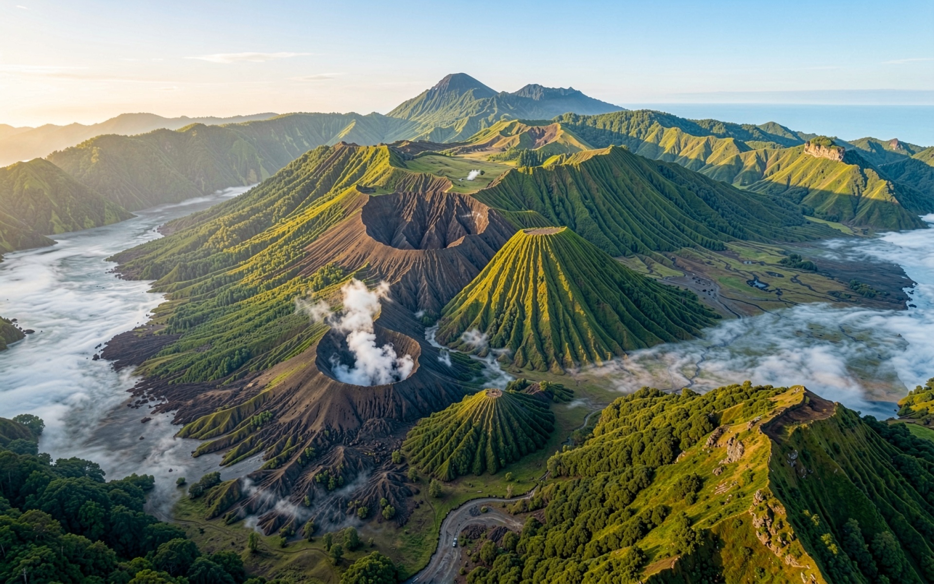 Изображение передает сложную текстуру вулканического пепла и резкие перепады высот конусов. Освещение характеризуется мягким утренним градиентом, где светлые участки неба контрастируют с глубокими тенями в кратерах. Белый туман заполняет низины, создавая эффект многослойности пространства. На сайте доступен удобный предпросмотр перед загрузкой для оценки качества на экране.