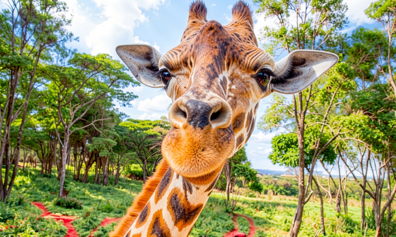 Скачайте с нашего сайта обои Жираф в зеленом лесу при дневном свете в формате JPG, так как эта JPG версия сохраняет все оттенки теней и света.