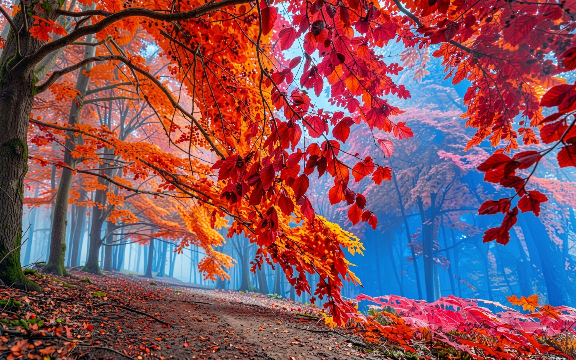 Техническое исполнение данной композиции сосредоточено на контрасте теплых оттенков листвы и холодного синего градиента заднего плана. Детализация текстур коры деревьев и прожилок каждого листа подчеркнута направленным освещением, которое создает мягкие блики на переднем плане и глубокие тени в глубине чащи. Рассеянный свет тумана сглаживает переходы между объектами, создавая эффект многослойности пространства. На сайте доступен удобный предпросмотр перед загрузкой для оценки качества отображения на вашем экране.