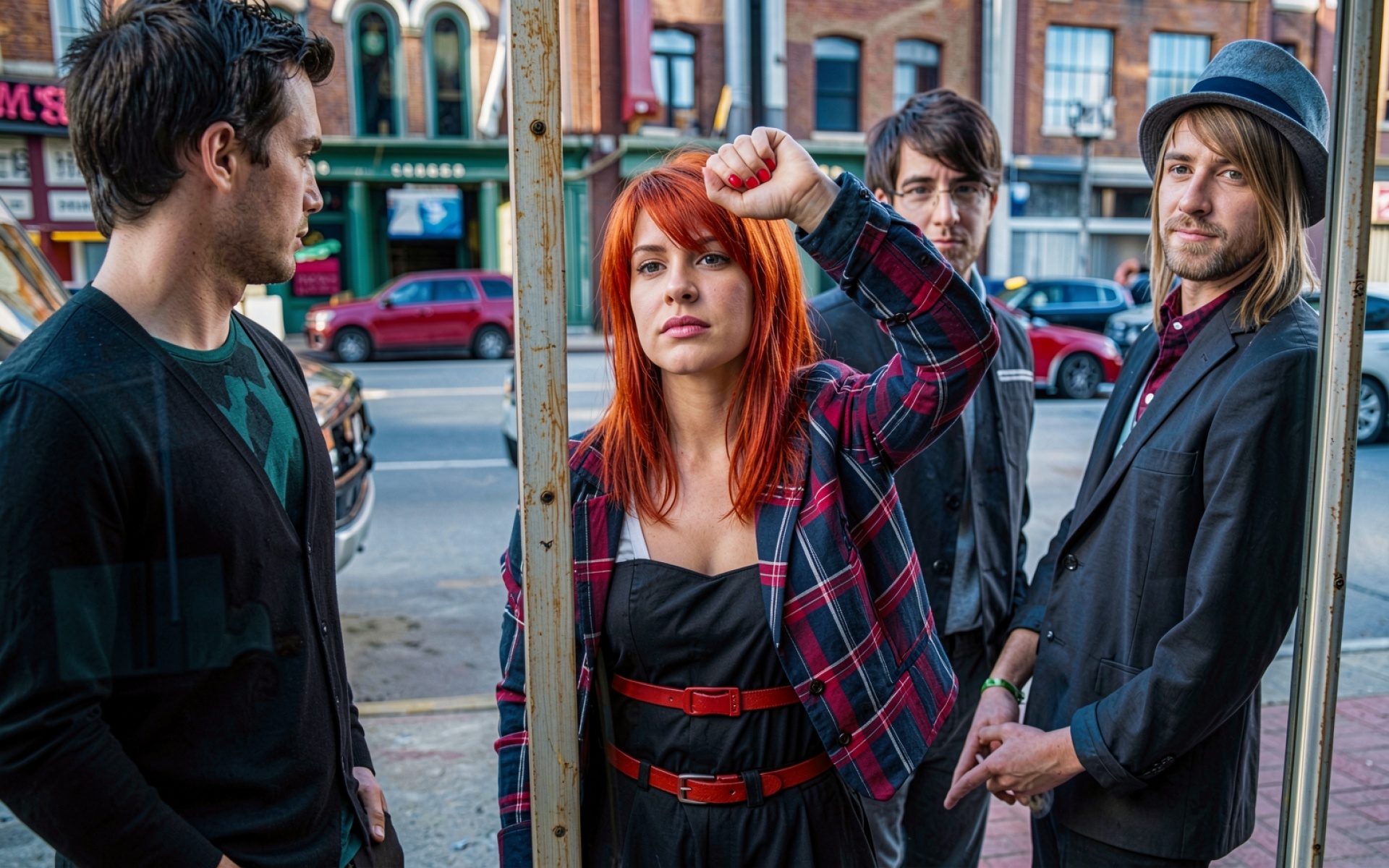 Изображение отличается детальной проработкой текстуры ткани фланелевой рубашки и естественным переливом медных оттенков волос. Освещение создает мягкие блики на лице, подчеркивая объем, а глубокие тени в складках одежды добавляют сцене реализма. Фон с городским пейзажем имеет плавный градиент размытия, что выделяет центральные фигуры. На сайте доступен удобный предпросмотр перед загрузкой для оценки качества на экране.