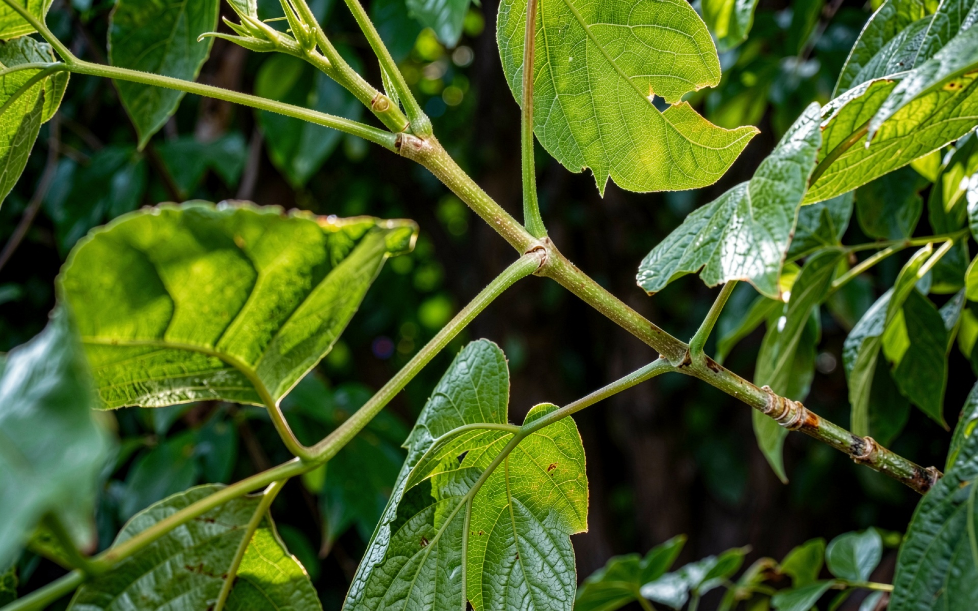 Изображение детально передает структуру листовых пластин с выраженным рисунком прожилок. Контровой свет создает яркие блики на глянцевой поверхности, подчеркивая объем каждой детали и создавая мягкие градиенты в тенях. Фон характеризуется естественным размытием, что акцентирует внимание на центральном стебле и текстуре коры. Сайт предоставляет удобный предпросмотр перед загрузкой для оценки качества на экране.