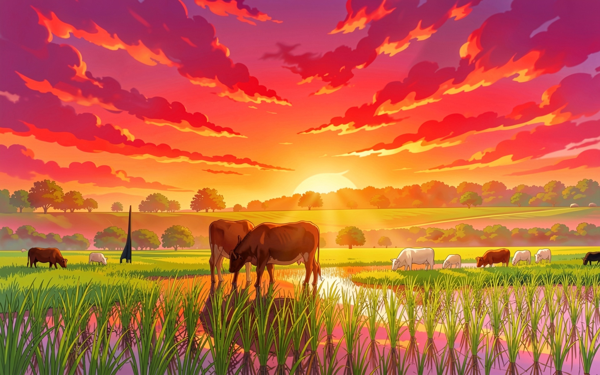 Скачайте JPG файл обоев Коровы на пастбище в лучах красного заката на нашем сайте – и вот почему: эта JPG версия сохраняет все оттенки теней и света