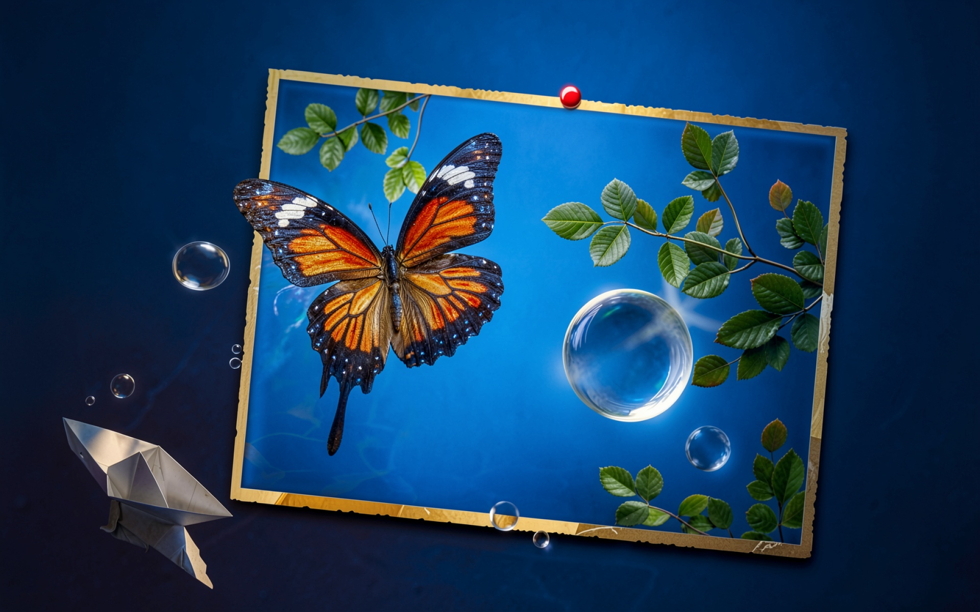 Изображение выделяется контрастом теплых оттенков крыльев и холодного фона. Текстура чешуек на крыльях проработана детально, а блики на поверхности сфер создают эффект объема и прозрачности. Мягкие градиенты синего цвета плавно переходят от глубоких теней к светлым участкам, подчеркивая геометрию композиции. На сайте доступен удобный предпросмотр перед скачиванием для оценки качества на экране.
