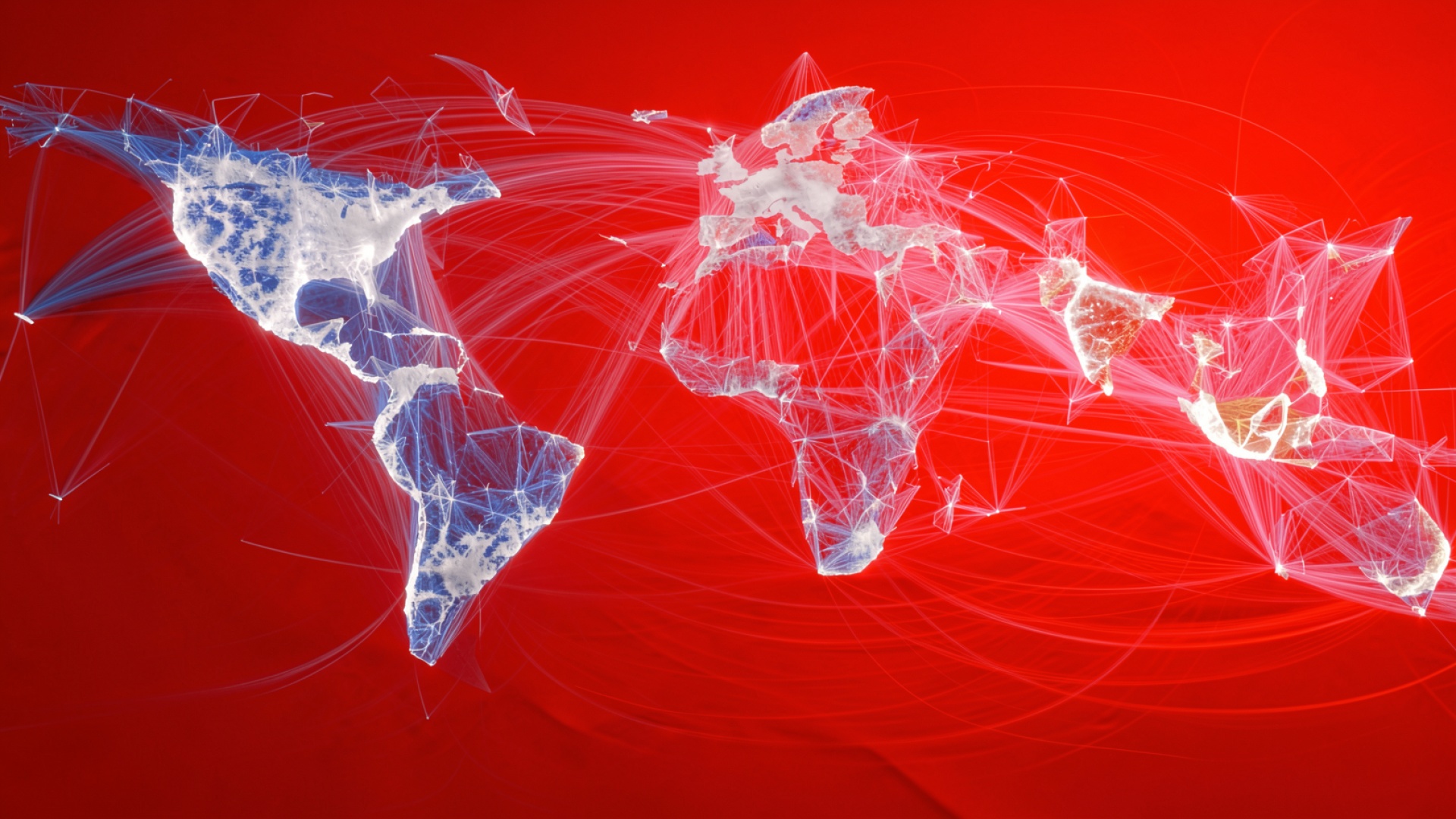 Изображение характеризуется сложной геометрией соединительных линий, которые формируют контуры континентов. Особое внимание уделено градиентам красного фона и контрастным белым узлам сети. Световые акценты распределены по точкам пересечения линий, создавая эффект глубины и объема за счет мягких теней в области переплетений. Сайт предоставляет удобный предпросмотр перед загрузкой для оценки качества на экране.