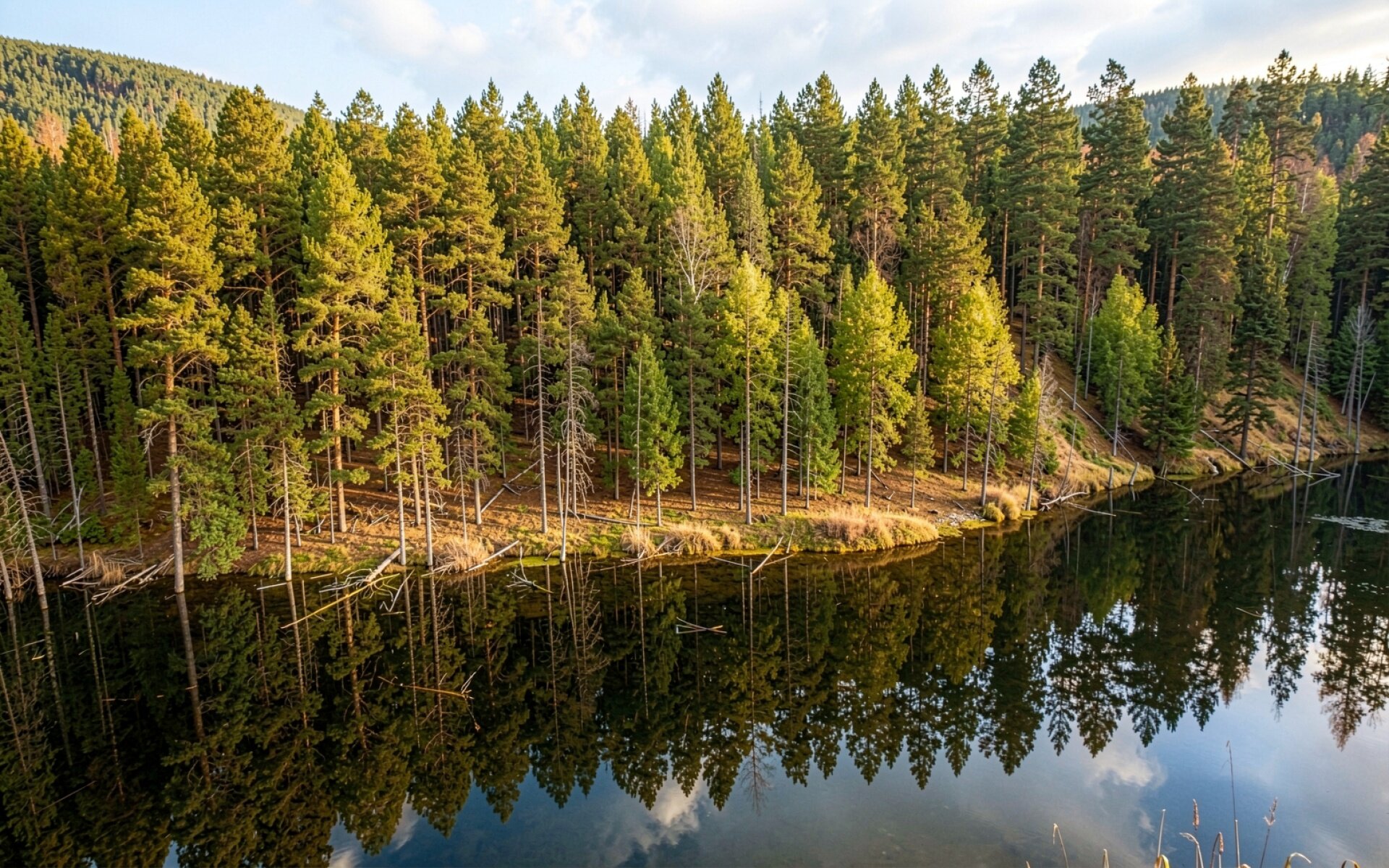Техническое исполнение кадра акцентирует внимание на вертикальных линиях стволов сосен и детальной прорисовке хвои. Освещение создает выраженные блики на верхушках деревьев и глубокие тени в нижней части лесного массива. Градиент неба плавно переходит в зеркальную поверхность воды, где отражения повторяют цветовую гамму оригинала. Сайт предоставляет удобный предпросмотр перед загрузкой для оценки качества на экране