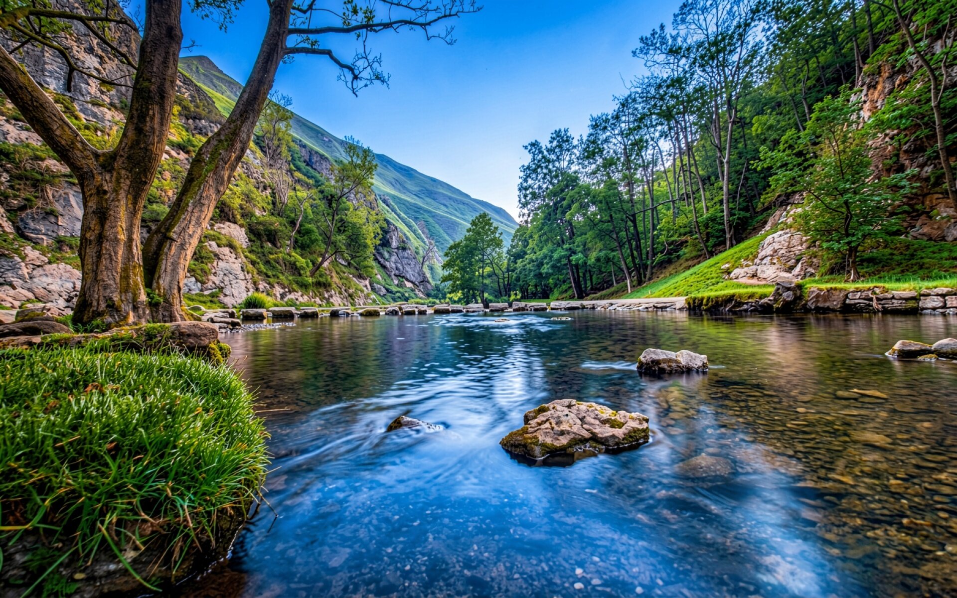Композиция выделяется детальной проработкой текстуры камней и плавными градиентами синего неба. Освещение создает мягкие блики на поверхности воды и глубокие тени в кронах деревьев, подчеркивая объем скалистых склонов. Контраст между насыщенной зеленью травы и холодными тонами потока придает сцене естественную глубину. На сайте доступен удобный предпросмотр перед загрузкой для оценки качества на экране.