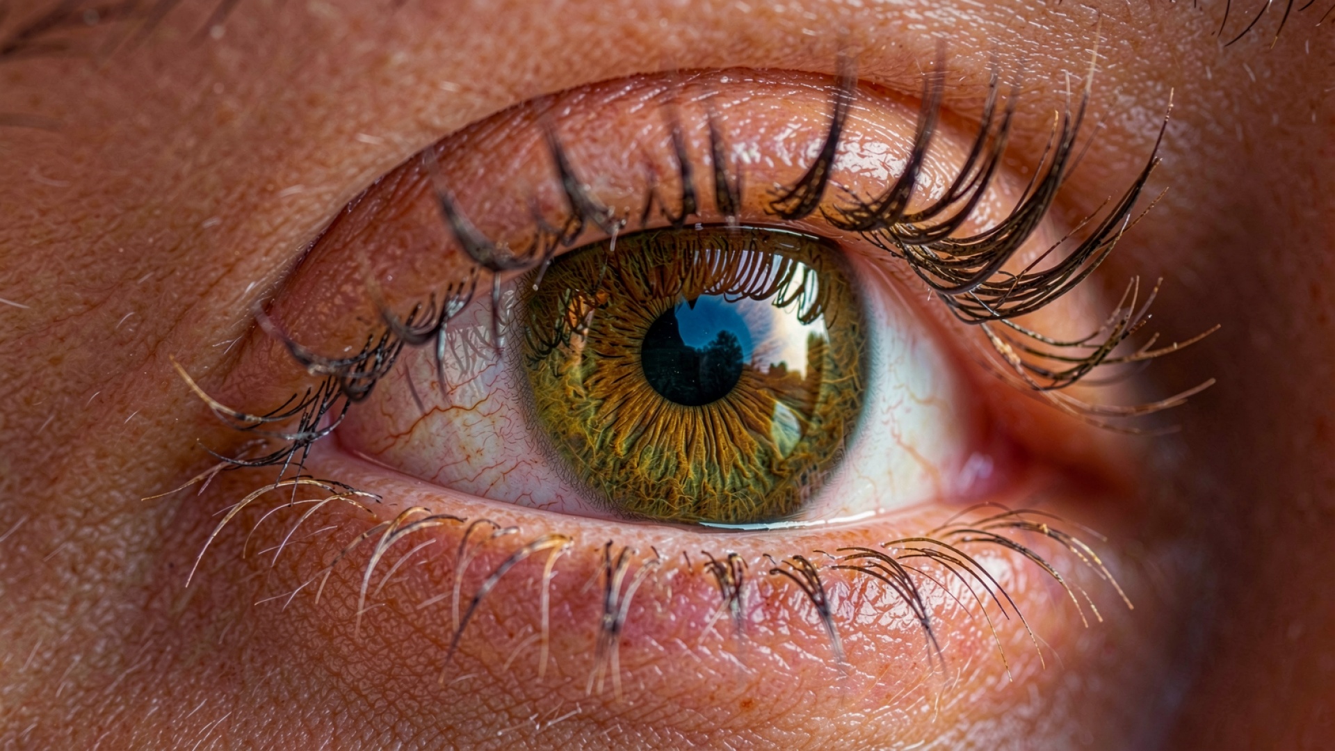 Изображение детально передает текстуру радужной оболочки с выраженными радиальными волокнами и глубокими оттенками охры. Освещение создает четкий блик на роговице, подчеркивая сферическую форму глаза, а мягкие тени в складках века добавляют объему. Градиенты кожи вокруг глаза переходят от теплых бежевых к насыщенным медным тонам. На сайте доступен удобный предпросмотр перед скачиванием для оценки качества на экране.