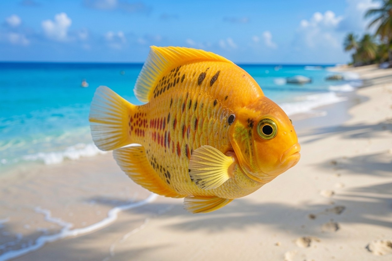 Техническое исполнение изображения акцентирует внимание на чешуе рыбы, где каждый сегмент имеет четкую детализацию и естественный блеск. Освещение имитирует яркий полуденный свет, создавая контрастные блики на плавниках и мягкие тени в области брюха. Фон с градиентом от бирюзового моря к белому песку дополняет композицию, а удобный предпросмотр перед скачиванием позволяет оценить качество цветопередачи на вашем экране.