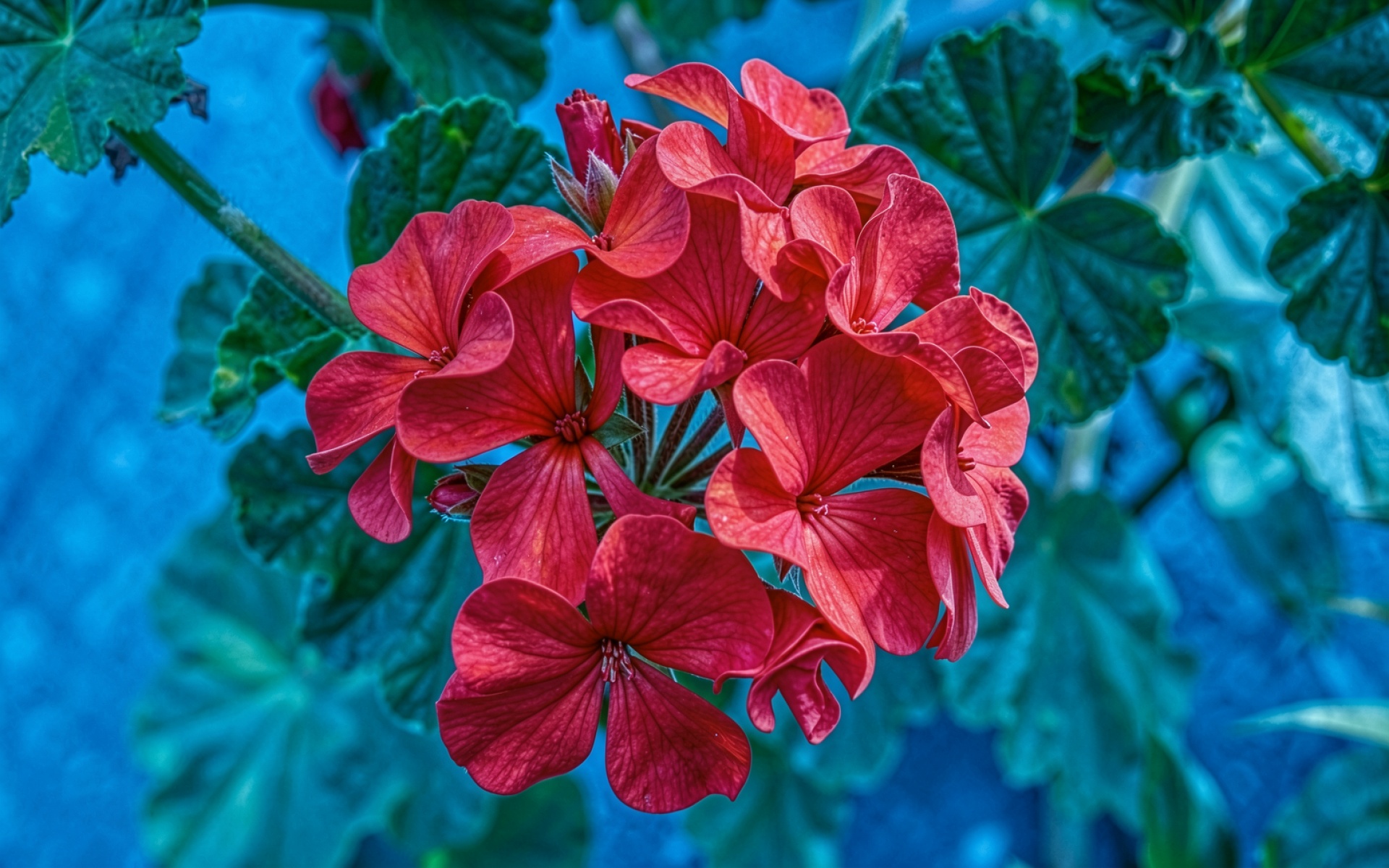 Красная герань на фоне синих листьев обои