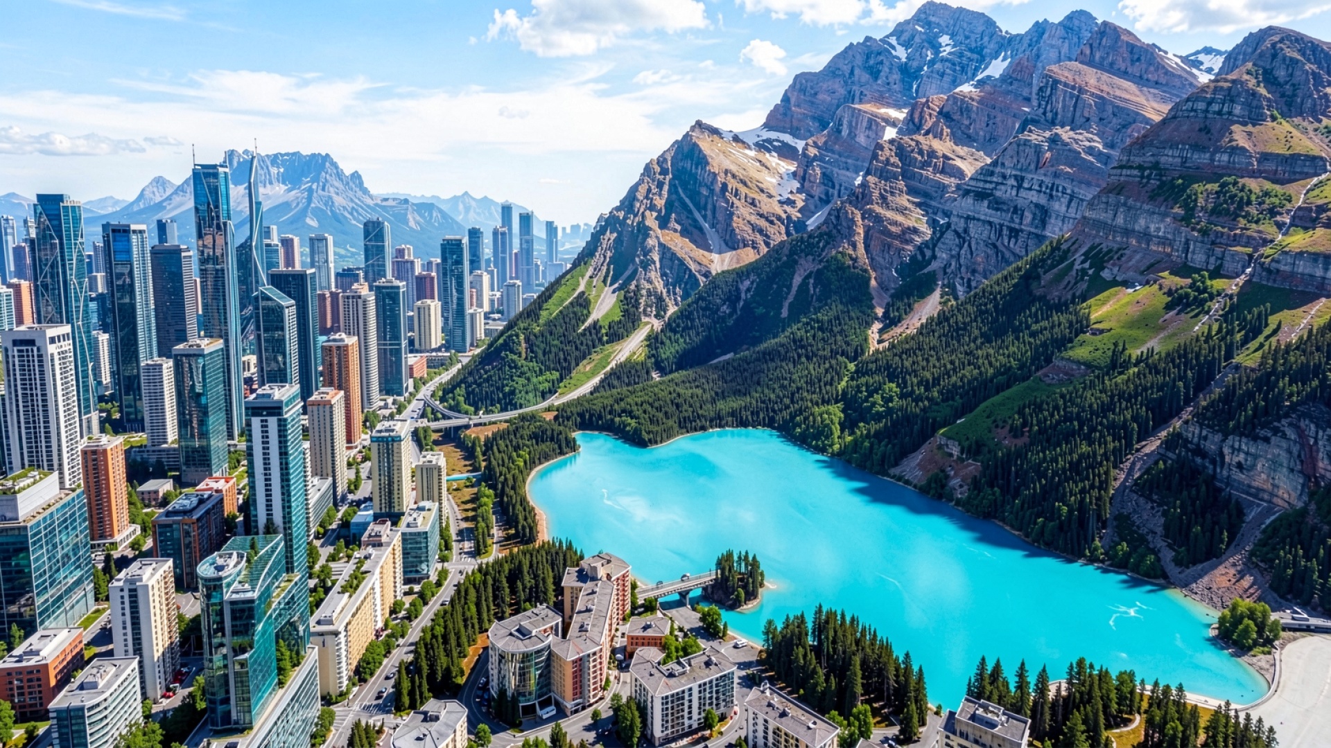 Изображение детально передает контраст между стеклянными фасадами небоскребов и грубой текстурой скальных пород. Освещение имитирует яркий дневной свет, создавая четкие тени в складках гор и выраженные блики на поверхности воды. Плавные переходы бирюзового цвета озера дополняют строгую геометрию городской застройки. Перед загрузкой доступен удобный предпросмотр для оценки качества отображения всех элементов на вашем экране.