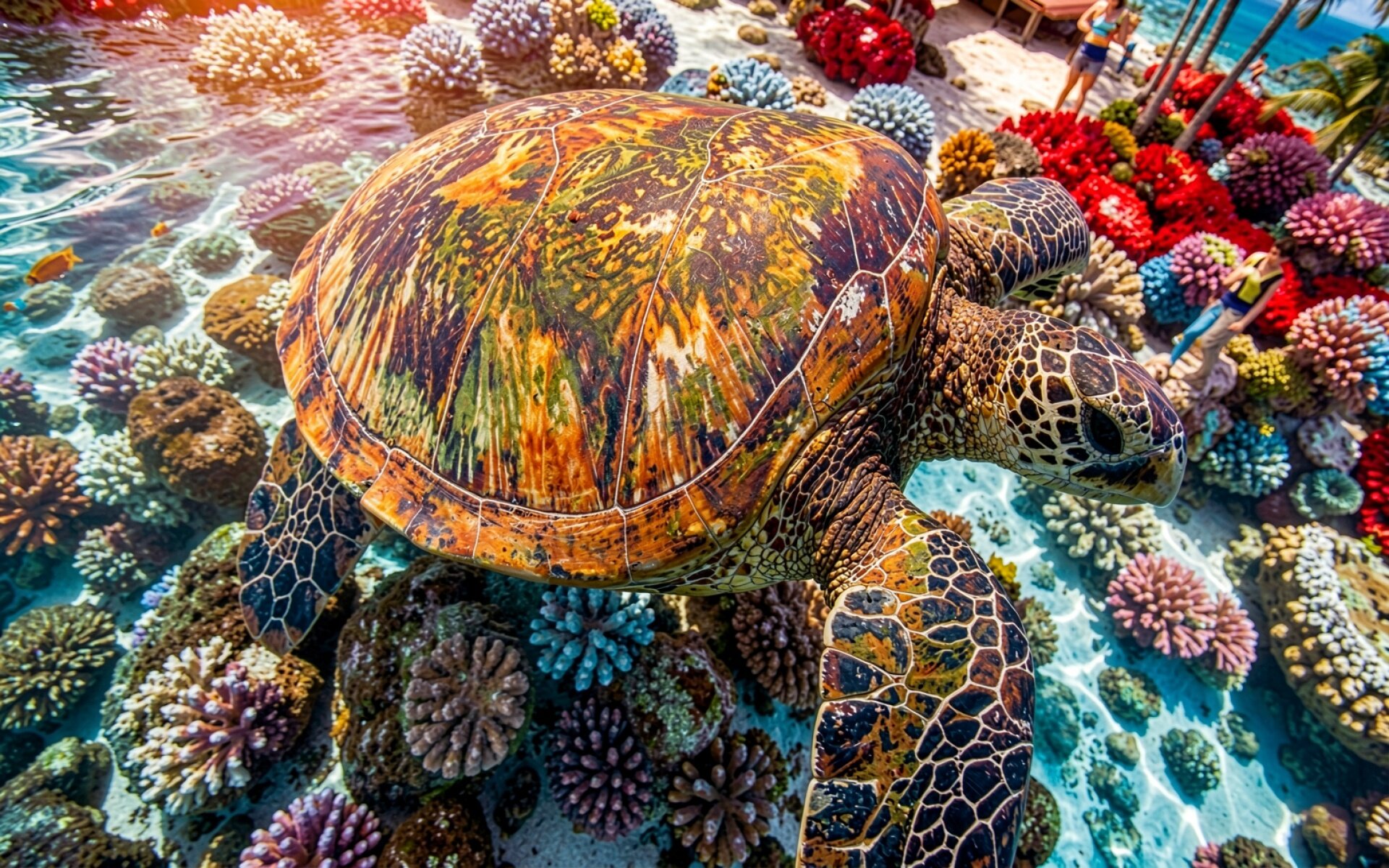 Морская черепаха среди ярких коралловых рифов обои