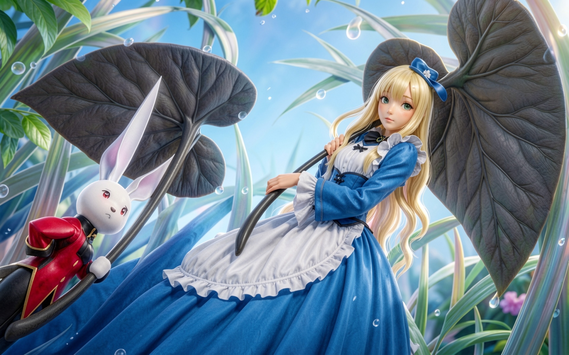 Изображение отличается детальной проработкой текстуры ткани платья и матовой поверхностью темных листьев. Освещение создает мягкие блики на золотистых волосах персонажа, а глубокие тени в складках одежды добавляют объему. Градиенты голубого неба на заднем плане плавно переходят в насыщенные оттенки зелени. На сайте доступен удобный предпросмотр перед скачиванием для оценки качества на экране.