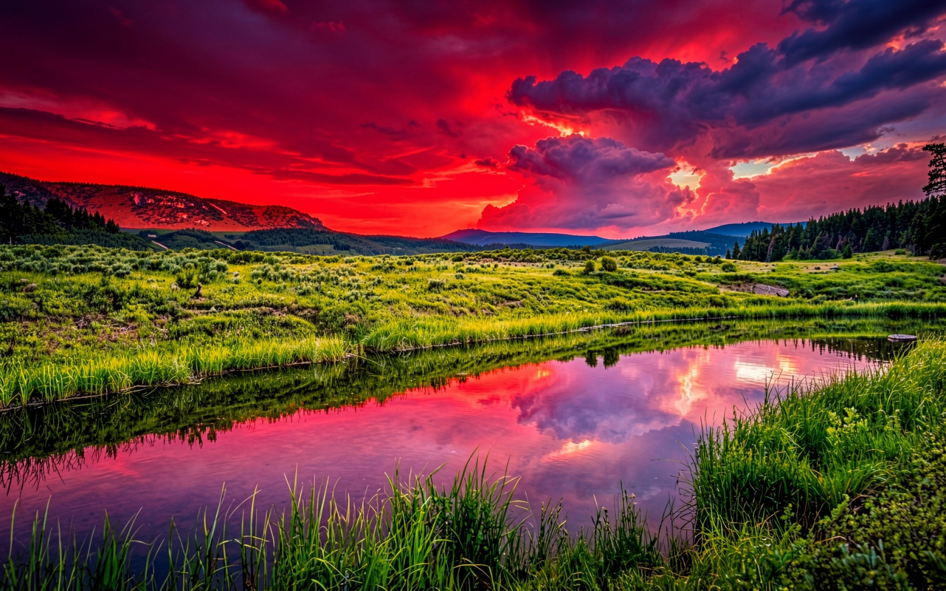 Красный закат над горным озером с травой обои