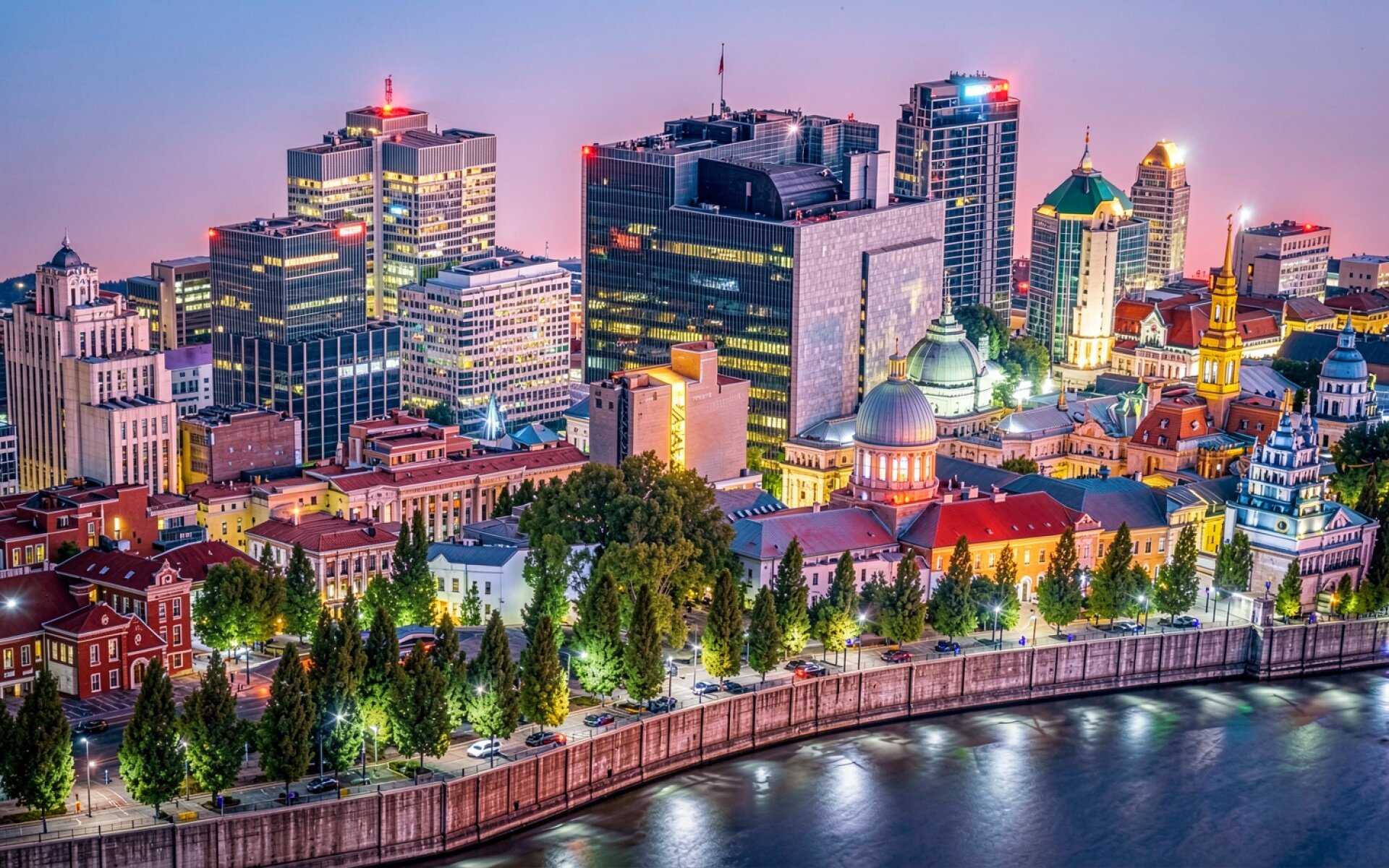 Изображение передает сложную геометрию городских зданий через контраст глубоких теней и ярких световых акцентов. Особое внимание уделено градиентам вечернего неба и отражениям огней в водной глади, что создает объемную перспективу. Текстуры бетона и стекла подчеркнуты точечными источниками света, а мягкое размытие заднего плана добавляет глубины композиции. Перед загрузкой на сайте доступен удобный предпросмотр для оценки качества отображения всех деталей на вашем экране.